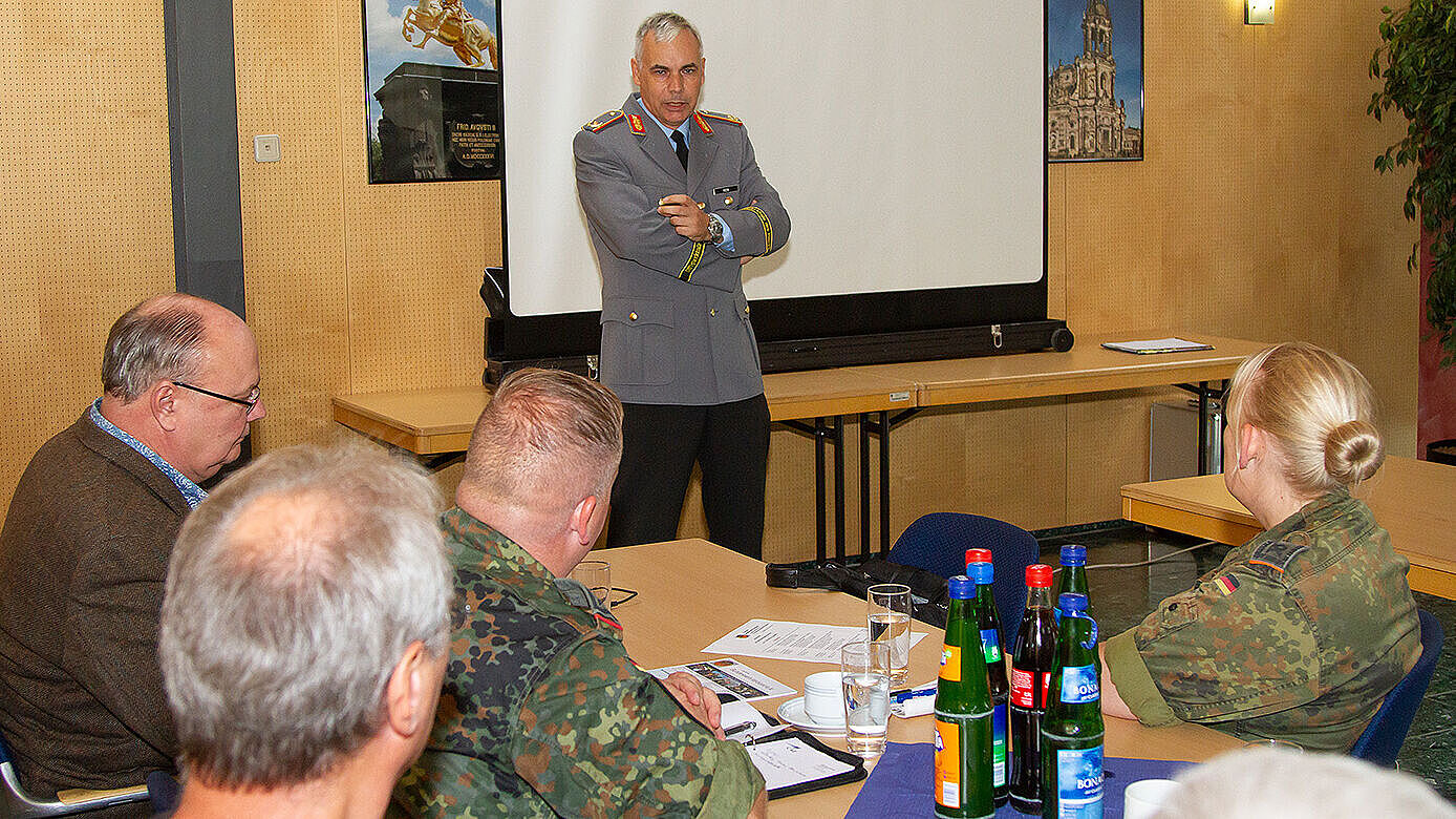Vor den etwa 20 Vorstandsmitgliedern aus den Kameradschaften am Standort Dresden begann er seine Ausführungen mit einigen Impressionen – in Ton und Bild – von der Einweihung der neuen Geschäftsstelle des DBwV in der Stresemannstraße 57, im Zentrum von Berlin, die am Vorabend unter Teilnahme von zahlreichen Gästen stattfand, darunter auch die Bundesministerin der Verteidigung und der Generalinspekteur der Bundeswehr.