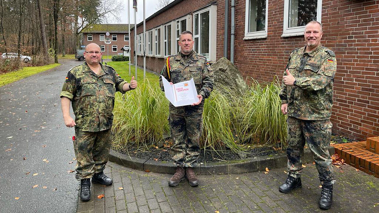 Nehmen den Geehrten, Oberstabsfeldwebel Daniel Vetter, in die Mitte: Oberstleutnant Oliver Kaiser (l.) und Stabsfeldwebel Hannes Dreier (r.). Foto: Johann Fritsch