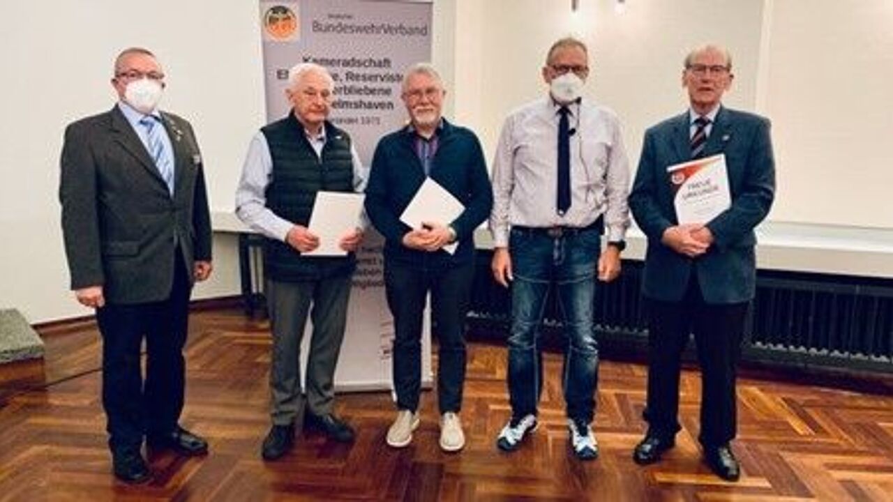 Wilhelmshaven. Auf der Mitgliederversammlung der Kameradschaft ehemaliger Soldaten, Reservisten und Hinterbliebene Wilhelmshaven wurden im Gorch-Fock-Haus folgende Mitglieder für ihre 50-jährige Treue zum Verband geehrt: Die Fregattenkapitäne a.D. Hans-Jürgen Forster und Michael Strenger sowie Kapitänleutnant a.D. Fritz Niedermeier.