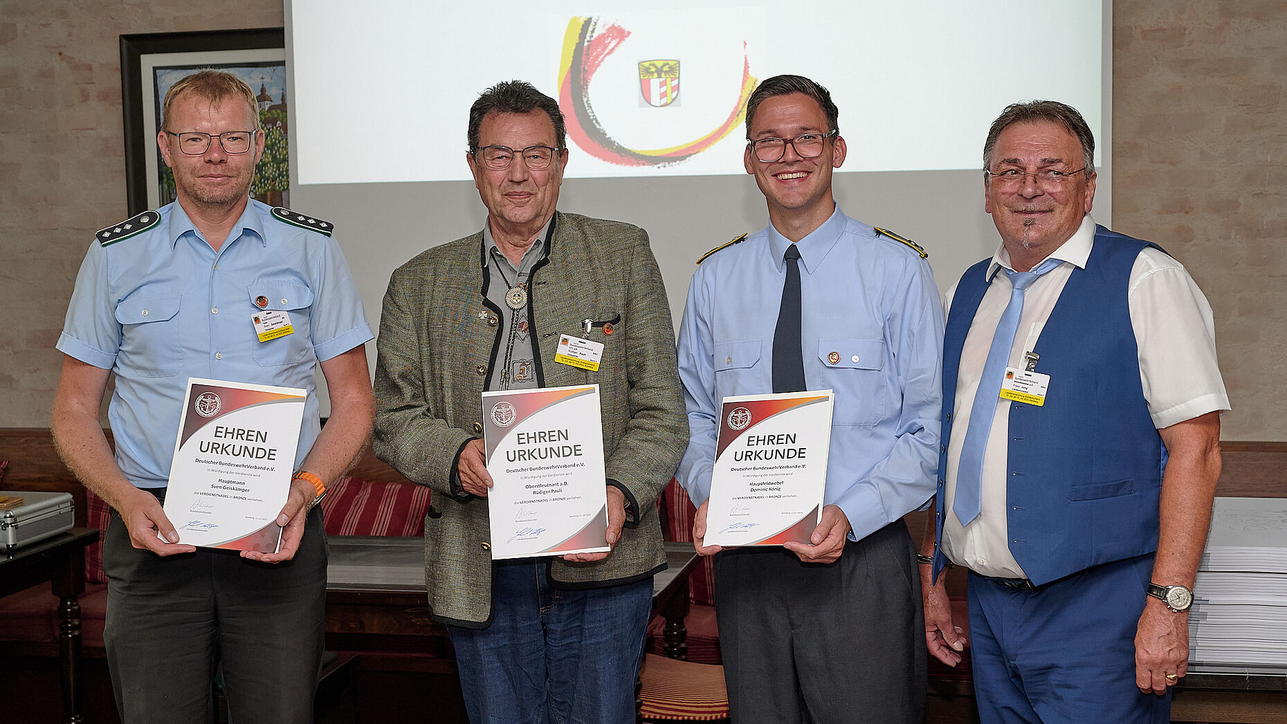 Vorsitzender Stabsfeldwebel a.D. Franz Jung zeigte sich vor den Delegierten seines Bezirkes Bairisch Schwaben bei der Landesversammlung zufrieden mit deren Arbeit in den Kameradschaften. Der Bezirk stehe deshalb so gut da, weil es dieses großartige ehrenamtliche Engagement gebe. Jung bedankte sich dafür bei erfahrenen und jungen Mandatsträgern seines Bezirkes. Die Verdienstnadel in Bronze erhielten Hauptmann Sven Geiskämper, Oberstleutnant a.D. Rüdiger Pauli (sKERH Donau-Iller) und Hauptfeldwebel Dominic König.