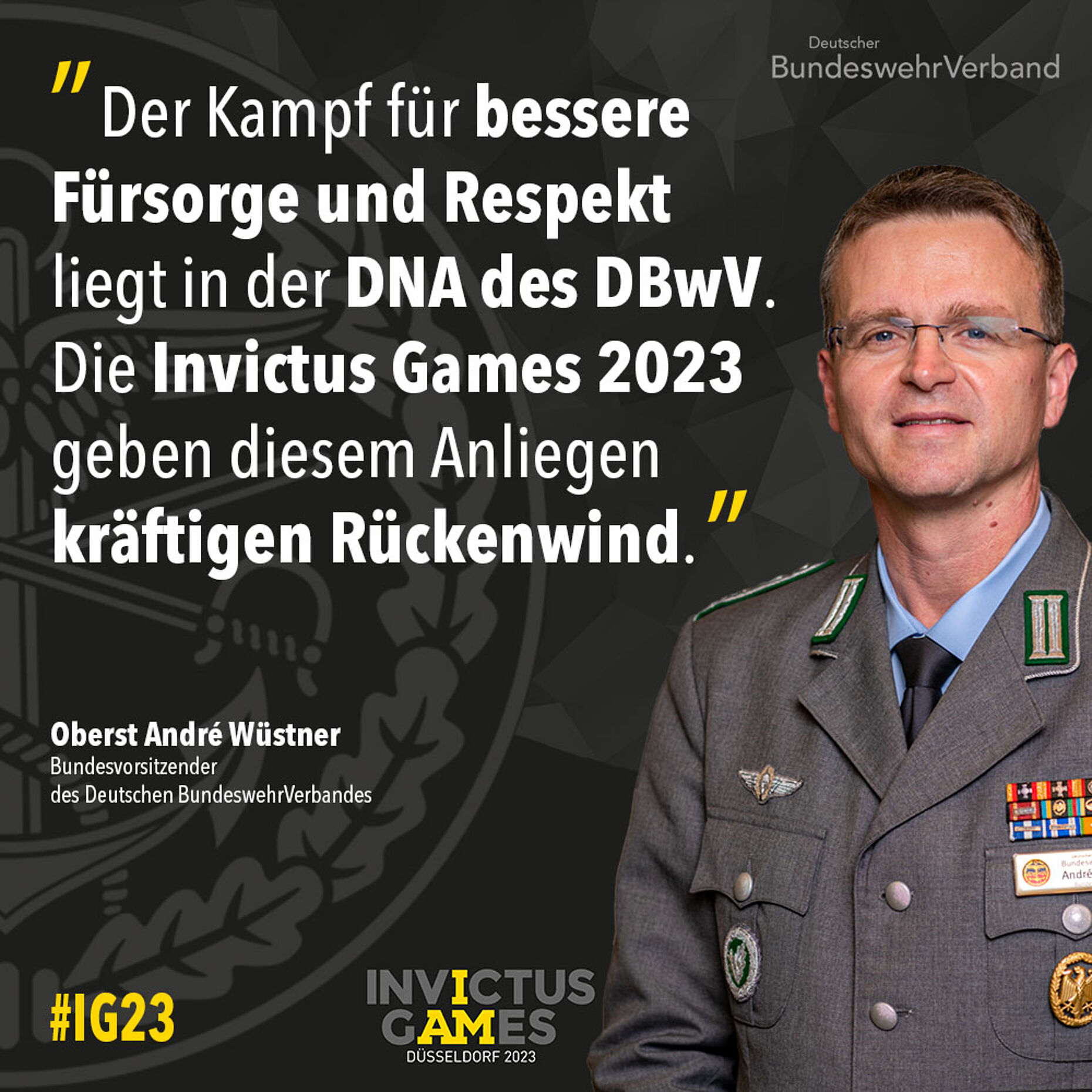 „Die Invictus Games bringen in einer unvergleichbar plakativen Weise zum Ausdruck, welchen Preis Soldatinnen und Soldaten für ihren Dienst im schlimmsten Falle zahlen müssen, nämlich Verwundungen an Leib und Seele. Sie zeigen, wie anspruchsvoll und anstrengend es sein kann, mit der Verwundung neuen Lebensmut zu finden und wie notwendig gesellschaftliche, aber auch kameradschaftliche Wertschätzung ist“, sagt der Bundesvorsitzende des Deutschen BundeswehrVerbands, Oberst André Wüstner.