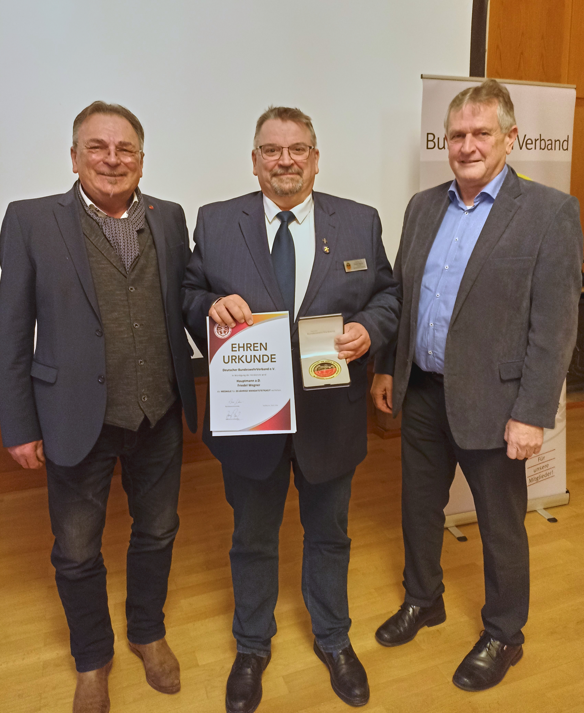 Ein weiterer Höhepunkt des Abends: Vorsitzender Wegner ehrte Hauptmann a.D. Peter Ahlvers für 25 Jahre Mitgliedschaft und Hauptmann a.D. Willibald Graf für beeindruckende 60 Jahre Treue zum DBwV.