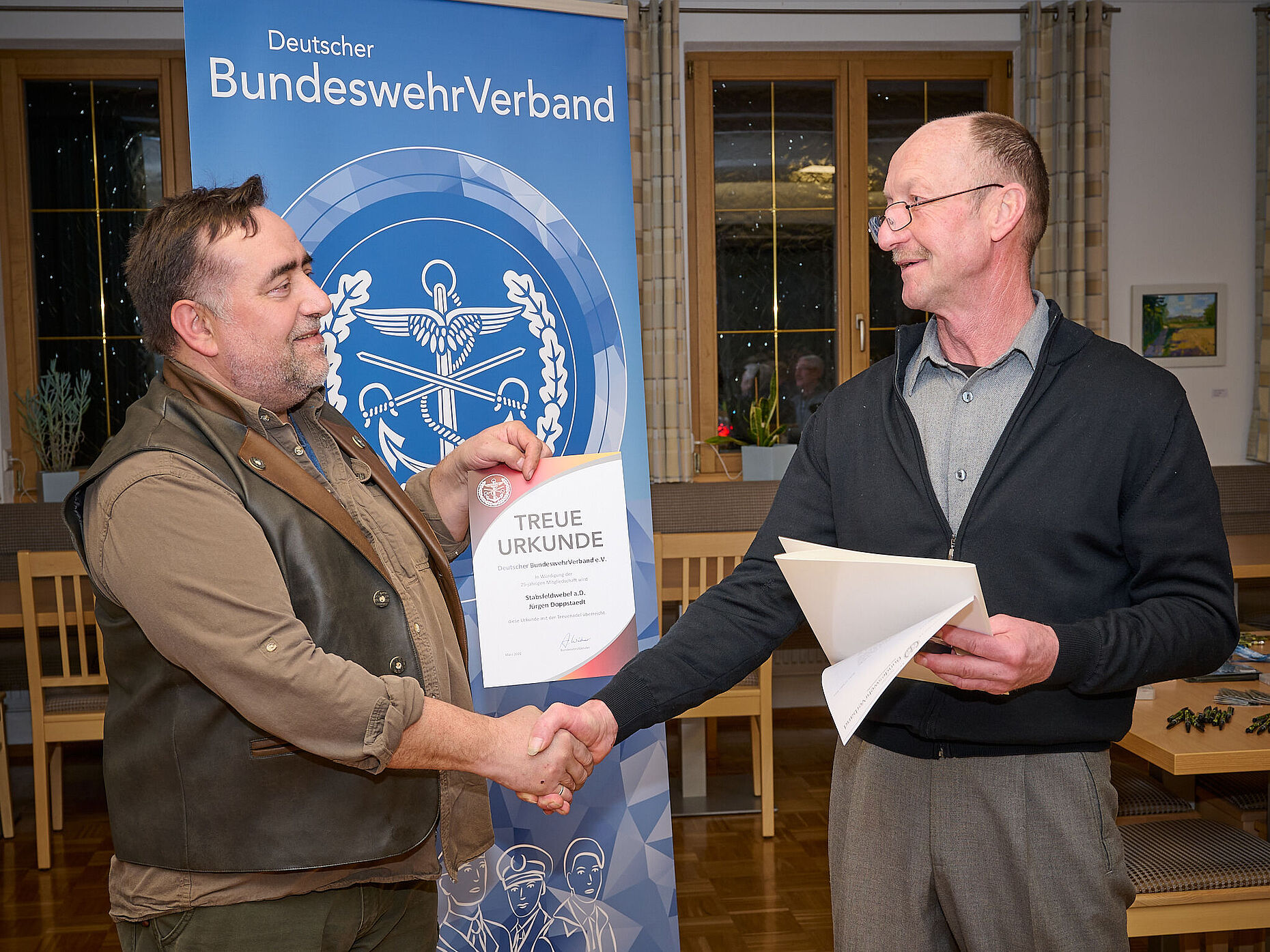 In einem weiteren Teil der Mitgliederversammlung stellte der Vorsitzende ERH im Landesvorstand, Oberstabsfeldwebel a.D. Bernhard Hauber, Leistungen der ausschließlich für Mitglieder der Kameradschaften ERH vorgesehenen neuen Pflege-Assistance vor und erläuterte die Gründe der generellen Anpassung des Mitgliedsbeitrag zum 01.07.2022. Hauber machte zudem auf eine Informationsreihe im Verbandsmagazin aufmerksam, in der ab April 2022 monatlich im Detail über die Pflege-Assistance berichtet werden soll. Vorsitzender Uiffinger verband mit der Ehrung von Stabsfeldwebel a.D. Jürgen Doppstädt für dessen 25-jährige Mitgliedschaft im DBwV die Hoffnung, künftig für solche Ehrungen vorgesehene und dazu angeschriebene Mitglieder für eine Teilnahme an Veranstaltungen der Kameradschaft gewinnen zu können.
