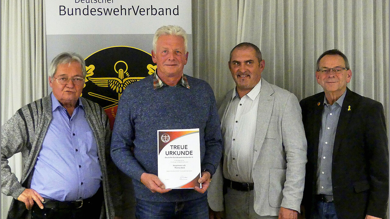 In Würdigung der 25-jährigen Mitgliedschaft im DBwV überreichte Josef Rauch dem Hauptmann a.D. Thomas Beck die Treueurkunde und die Treuenadel des Verbandes.