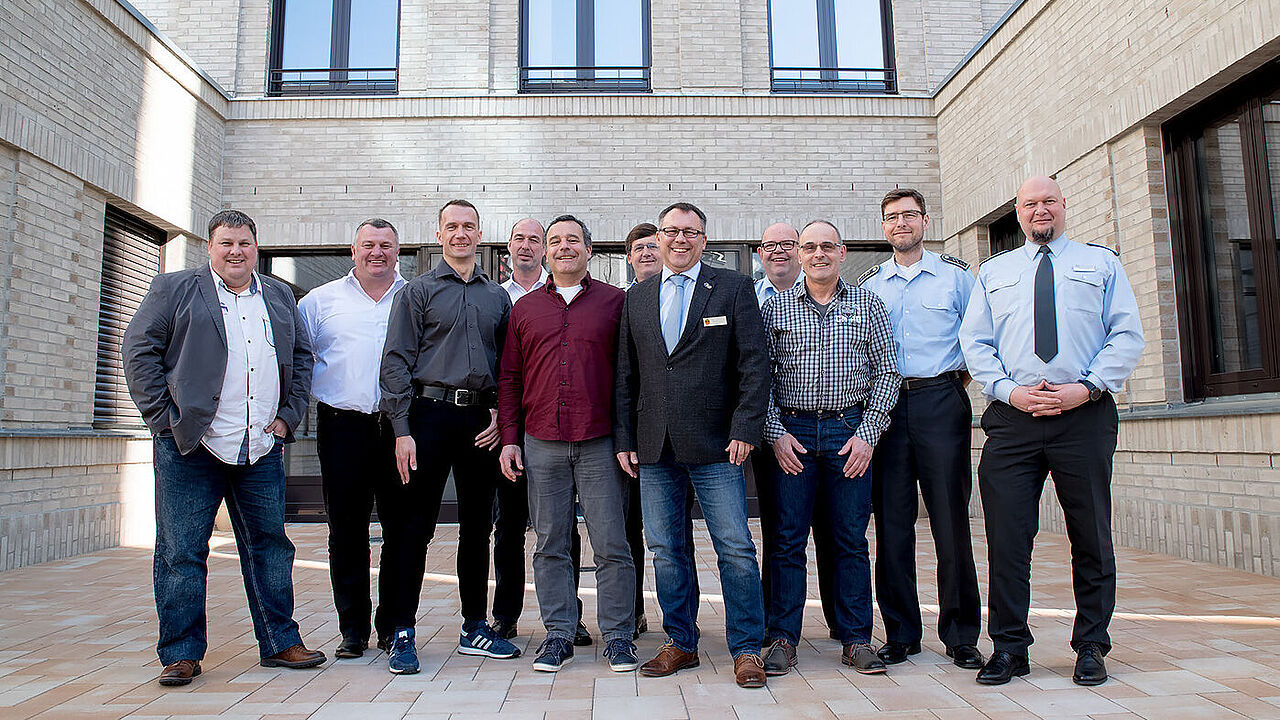 Guter Start in Berlin (v.l.): Oberbrandmeister Christian Biermann (ZBrdSchBw KoordSt West Köln), Hauptbrandmeister Frank Bier (BwF Baumholder), Oberbrandmeister Michael Kasche (BwF Bückeburg), Oberbrandmeister Christian Rehhorn (BwF Manching), Oberbrandmeister Michael Otten (BwF Wilhelmshaven), Brandsamtsrat Christian Frey (BwF Kalkar), Regierungsamtsinspektor Bernd Kaufmann, Hauptmann Ralph Osterkamp (ZBrdSchBw Sonthofen), Oberbrandmeister Rüdiger Laux (BwF Kalkar), Oberstabsfeldwebel Thomas Leniger (ZBrdSchBw Sonthofen) und Hauptmann Kai-Ingo Behnke. Foto: DBwV/Bombeke