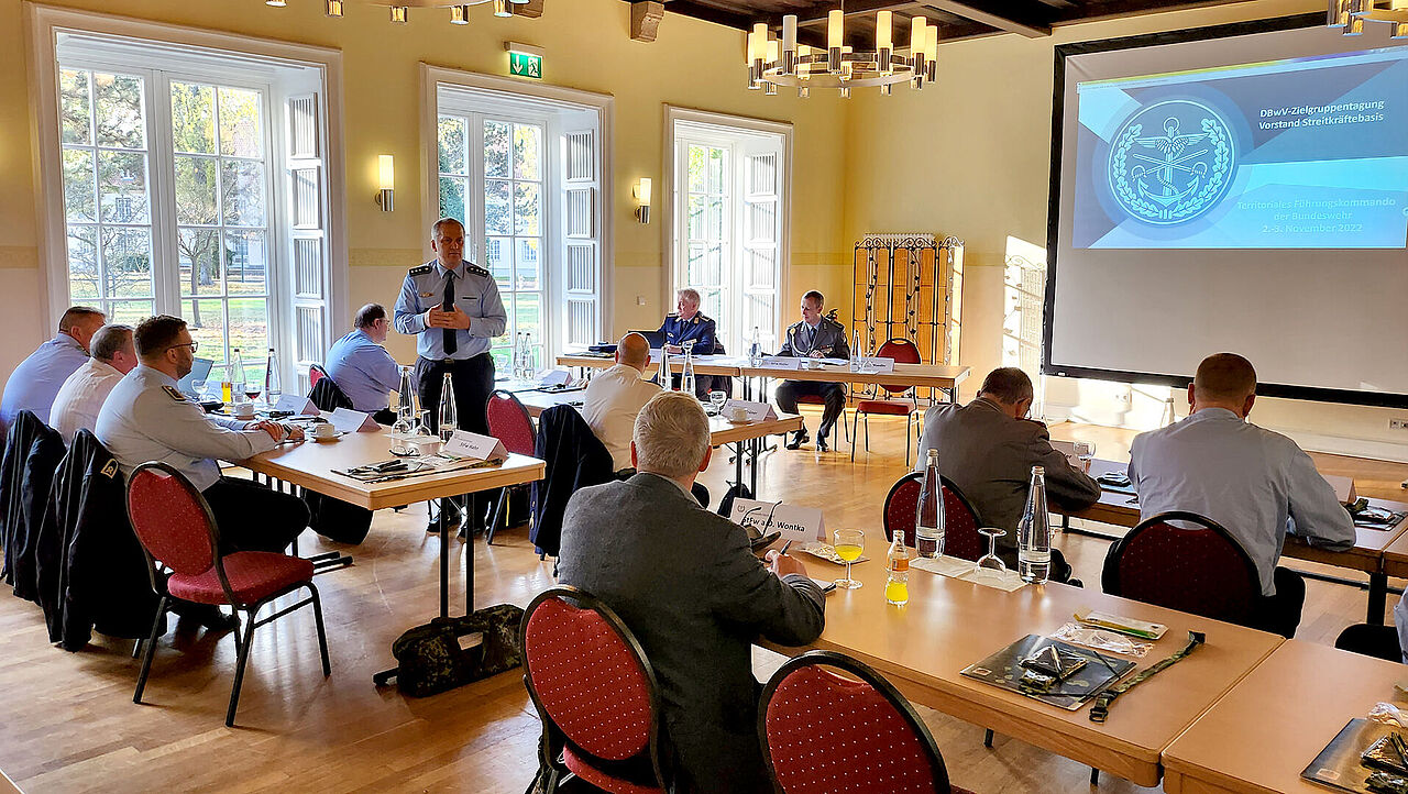 Start der Zielgruppentagung für das Territoriale Führungskommando der Bundeswehr in der Berliner Julius-Leber-Kaserne. Zu Beginn der zweitägigen Veranstaltung informiert der Vorstand SKB über die aktuelle Verbandspolitik des DBwV. Foto: DBwV/Yann Bombeke