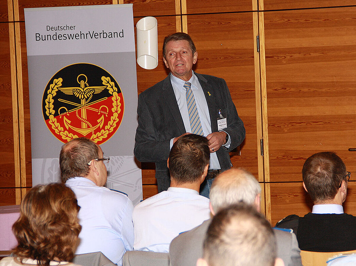 Nach den einleitenden Worten durch den Bezirksvorsitzenden Hauptmann a.D. Michael Grothe sowie der Begrüßung durch den Leiter der Fachschule des Heeres für Technik, Oberstleutnant Holger Fleckenstein startete das Tagesseminar mit dem Schwerpunktthema: Das Versorgungsrecht der Berufssoldaten. Stabshauptmann a.D. Eberhard Mandel von der Karl-Theodor-Molinari-Stiftung (KTMS) informierte in seinem Vortrag "nicht nur trocken" über die gesetzlichen Vorgaben aus fachlicher Sicht. Als ehemaliger Berufssoldat wusste er auch von unzähligen Beispielen "aus der Praxis für die Praxis" zu berichten und ließ auch diesen Praxisinformationen ausreichend Raum. Neben den Veränderungen im Versorgungsrecht und den Berechnungsmodi des Ruhegehaltes umfassten seine Ausführungen auch die Hinzuverdienstregelung, das Zusammentreffen von Ruhegehalt und Rente, die Versorgungsausgleichsproblematik bei geschiedenen Berufssoldaten und nicht zuletzt auch die Hinterbliebenenversorgung bzw. Witwenversorgung. Alles in allem eine Menge Stoff in kurzer Zeit, der den Seminarteilnehmern ein hohes Maß an Aufmerksamkeit und Konzentration abverlangte. Schlag auf Schlag ging es weiter. Im schwierigen Themenkomplex „Beihilfe des Bundes“ wurden die 55 Tagungsteilnehmer schließlich durch Regierungsamtmann Uwe Serafin informiert. Der Mitarbeiter des Sozialdienstes der Bundeswehr erläuterte unter anderem, dass die Beihilfe die aus den laufenden Bezügen zu bestreitende gesundheitliche Eigenvorsorge ergänzt und somit für Soldaten eine finanzielle Unterstützung in Krankheits-, Pflege- und Geburtsfällen darstellt.