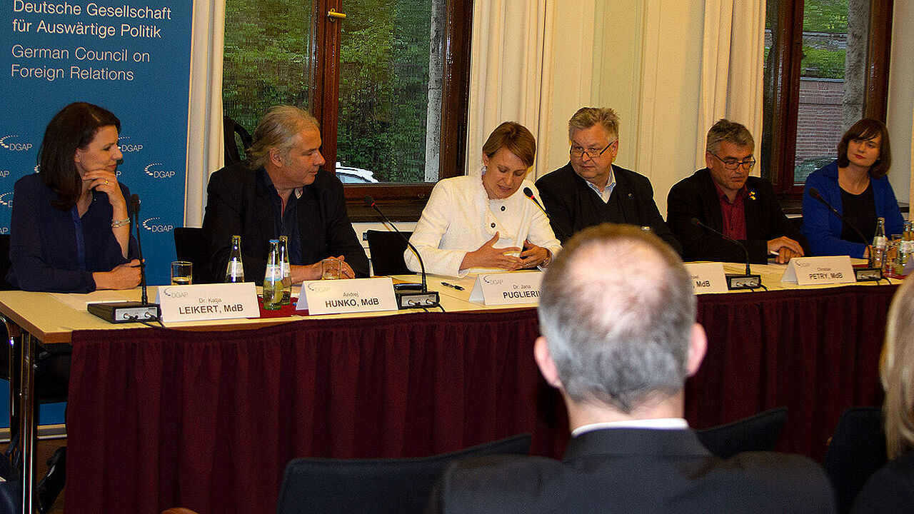 Im Gespräch: Die Politiker Dr. Katja Leikert (CDU/CSU, v. l.), Andrej Hunko (Die Linke), Moderatorin Dr. Jana Puglierin, Michael Link (FDP), Christian Petry (SPD) und Claudia Müller (Bündnis 90/Die Grüne). Foto: DBwV/Vieth