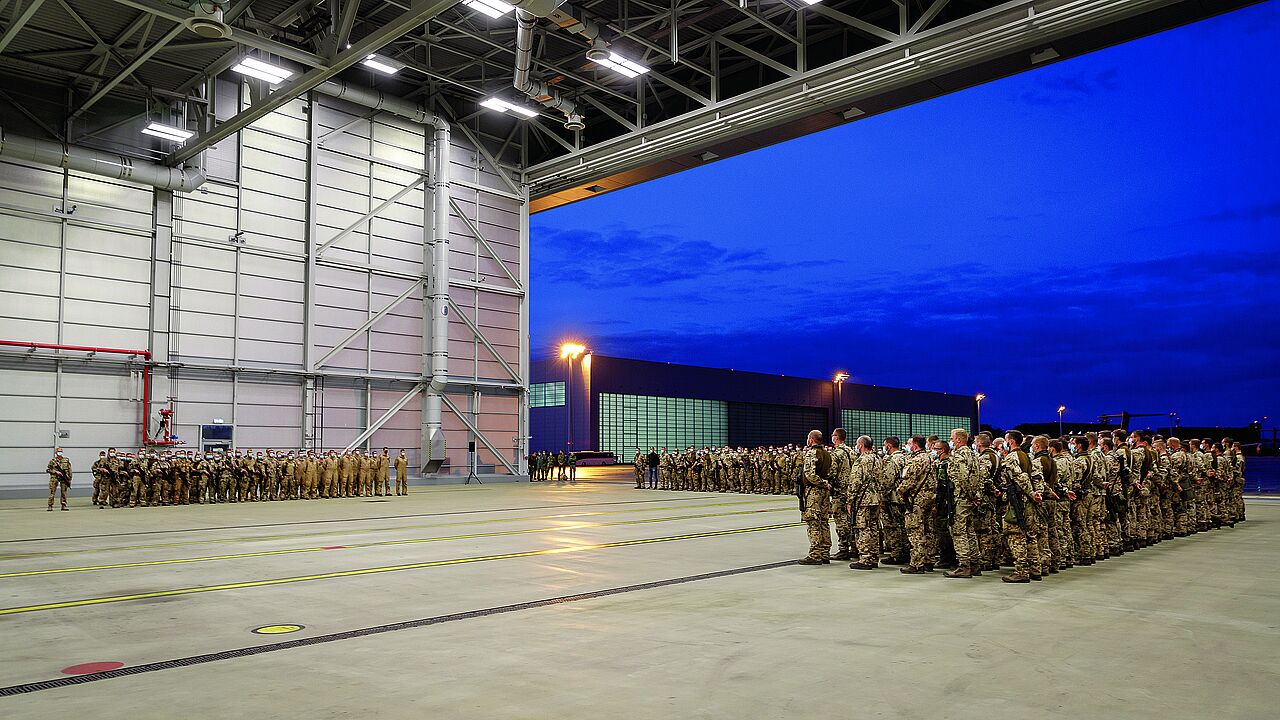 Soldaten der militärischen Evakuierungsoperation Afghanistan sind nach der Ankunft in einer Halle auf dem Fliegerhorst Wunstorf am 27. August 2021 angetreten. Foto: Bundeswehr/Neumann