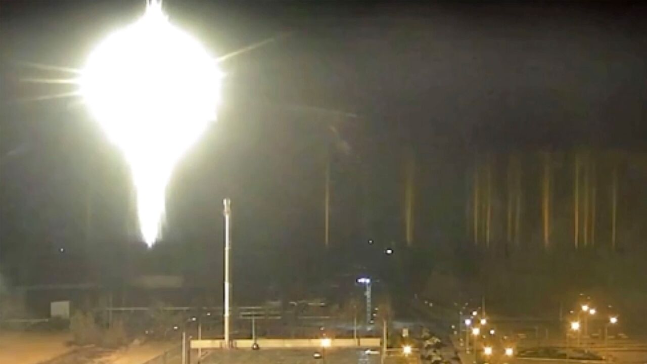 Dieses Bild stammt aus einem vom Kernkraftwerk Saporischschja veröffentlichten Video. Es zeigt ein helles, flackerndes Objekt, das am Freitag, den 4. März 2022, auf dem Gelände des Kernkraftwerks bei der Stadt Enerhodar landet. Russische Streitkräfte beschossen am frühen Freitag die Stadt und Europas größtes Kernkraftwerk. Foto: picture alliance