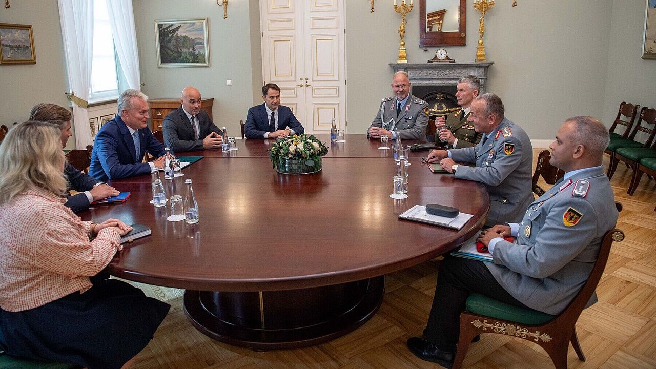 In Vilnius traf sich General Carsten Breuer (2.v.r.) mit dem litauischen Präsidenten Gitanas Nauseda (3.v.l.), um die Fortschritte bei der Planung der Stationierung einer deutschen Brigade in dem baltischen Land zu besprechen. Foto: BMVg/Twitter