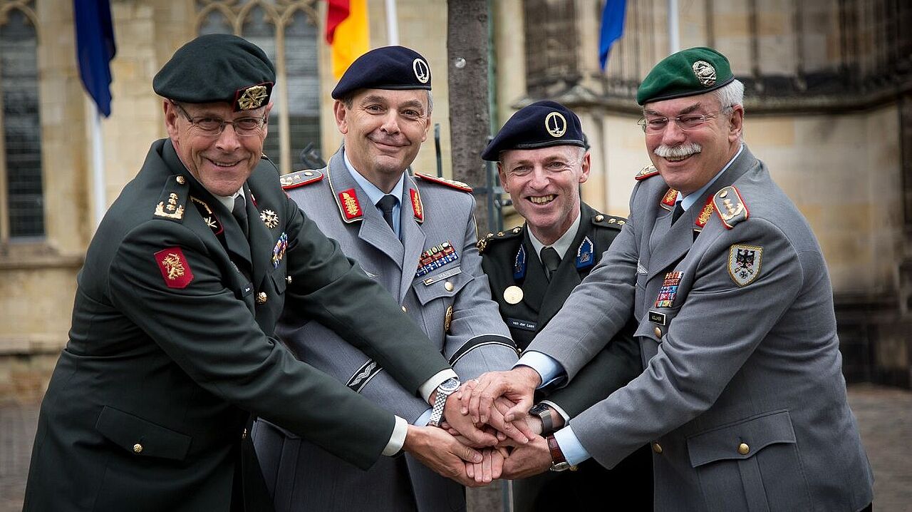 Bei der Kommandoübergabe in Münster (v.l.n.r.): Generalleutnant Leo Beulen, Generalleutnant Alfons Mais, Generalleutnant Michiel van der Laan und Generalleutnant Jörg Vollmer. Foto: Bundeswehr/Marco Dorow