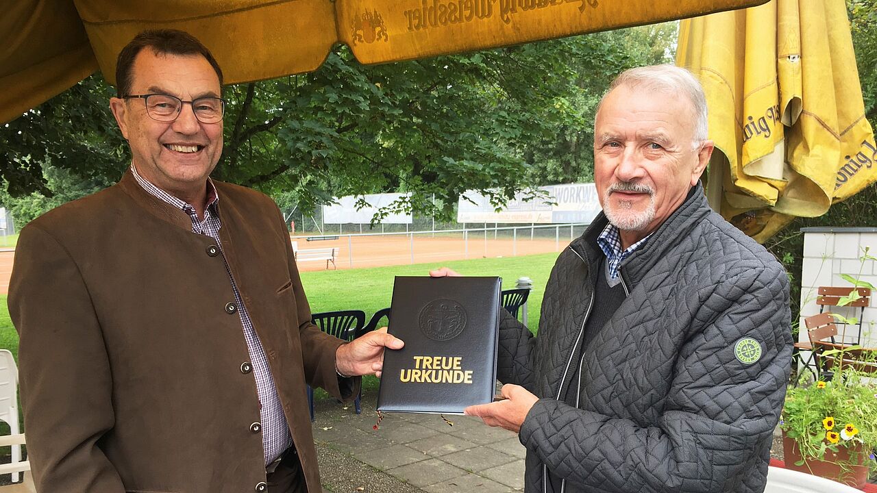 Der Schriftführer der Kameradschaft, Hauptmann a.D. Günther Parthon (im Bild rechts), erhielt für seine 50-jährige Mitgliedschaft von Vorsitzendem Pauli die Urkunde die Treuenadel des Deutschen BundeswehrVerbandes.