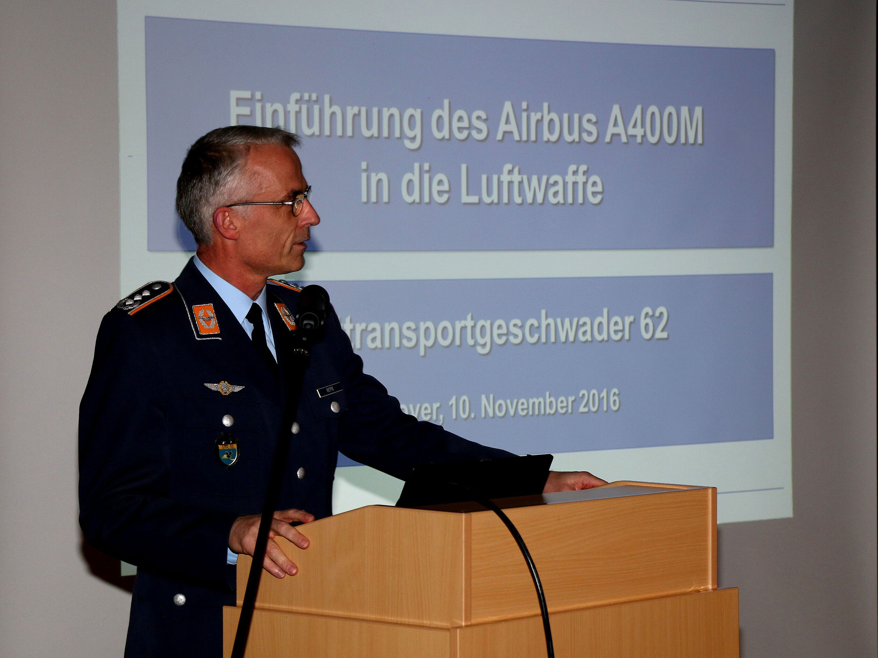 Im weiteren Verlauf stellte Bette das Fähigkeitsspektrum dieses außergewöhnlichen Transportfliegers heraus. Im Vergleich zur Transall C-160, dem Vorgängermodell, ist die Transportkapazität um ca. das 2-3 fache erhöht, bei doppelter Reisegeschwindigkeit und dreifacher Reichweite. „Mit dem A400M haben wir einen Personal- und Materialtransport von Wunstorf nach Bamako und zurück nach Wunstorf in 21 Stunden durchgeführt. Für den gleichen Einsatz wären ca. 3 Transall notwendig gewesen, die dabei mindestens die doppelte Zeit benötigt hätten.“Weiter gab er einen Einblick in die internationalen Kooperationsplanungen, z. B. die geplante gemeinsame A400M - Ausbildung mit französischen Piloten ab Sommer 2017.