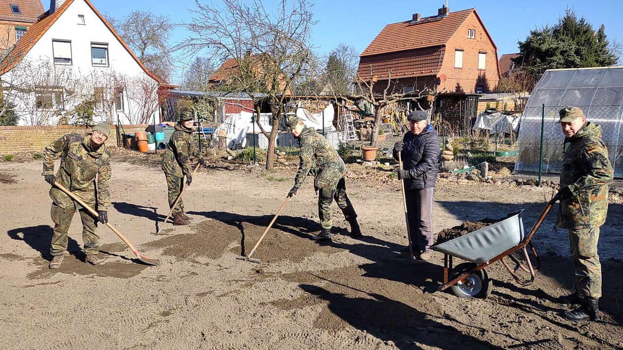 Aktive und ehemalige Soldaten bei der gemeinsamen Arbeit. Foto: Norbert Peterssohn