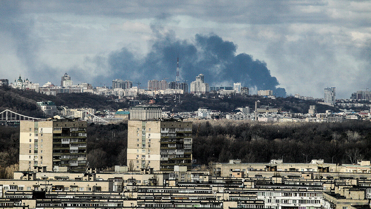 Kiew am Sonntagmorgen: Am Horizont sind Rauchwolken zu sehen. Die Gefechte im Land gehen unvermindert weiter. Foto: picture alliance / Photoshot