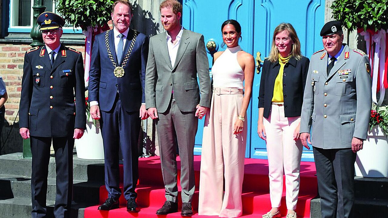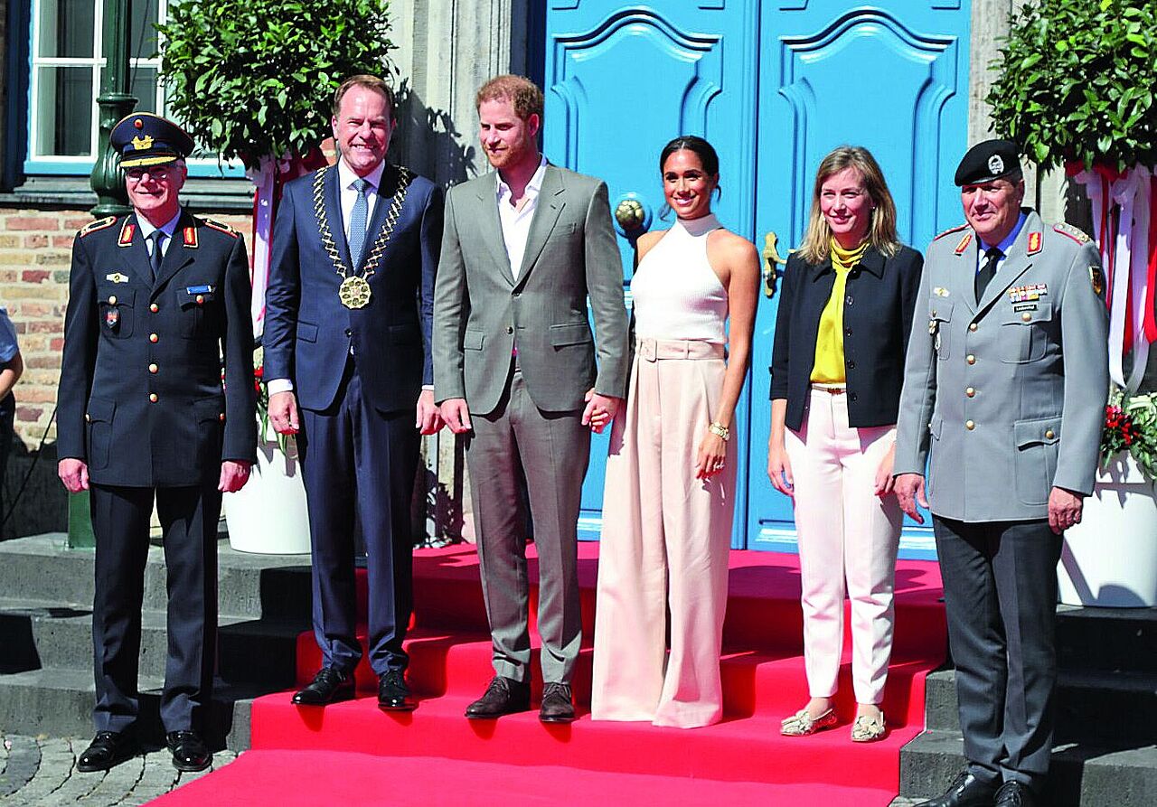Brigadegeneral Alfred Marstaller, Düsseldorfs Oberbürgermeister Stephan Keller, Prinz Harry, Meghan, Herzogin von Sussex, die Bundestagsabgeordnete Siemtje Möller und Generalleutnant Markus Laubenthal (v.l.) Foto: Stadt Düsseldorf