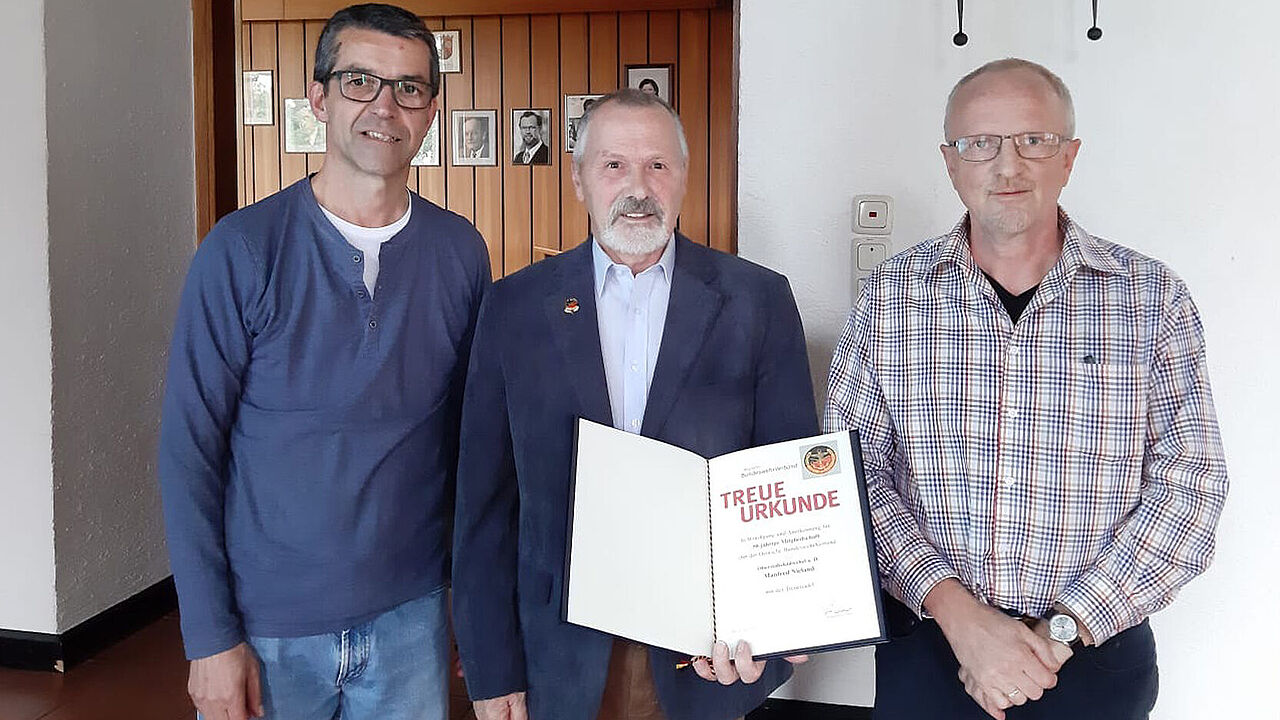 (v.l): Vorsitzender Stefan Hoffmann mit dem Geehrten Manfred Nieland und dem Referenten Eckhard Kunz. Foto: KERH Idar-Oberstein