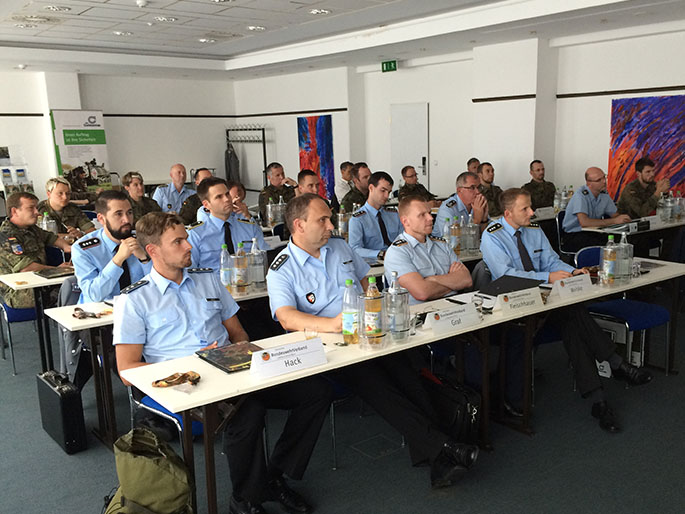 Brigadegeneral Hans-Georg Klein vom Bundesamt für Personalmanagement der Bundeswehr informierte über die Rahmenbedingungen der Personalführung, insbesondere zur Trendwende Personal. Bei der Umsetzung stünden Qualität und Freiwilligkeit an oberster Stelle. Bei Problemfällen sei es wichtig, immer erst das Gespräch zu suchen. Das sei unkomplizierter und effektiver, als wenn Betroffene Beschwerdebriefe schreiben. Zur Unterstützung der Trendwende Vertrauen bot Klein die Hilfe der Personalführer seiner Abteilung an. Zum Thema Soldatenarbeitszeitverordnung trug der zuständige Referatsleiter des DBwV, Sebastian Lohmüller, vor. Er zeigte die vom DBwV festgestellten Problembereiche und entsprechende Lösungsmöglichkeiten auf. Lohmüller äußert sich ausführlich zu diesem Thema in der Oktoberausgabe des Verbandmagazins „Die Bundeswehr“. Oberst i.G. Frank Richter aus der Abteilung Politik des BMVg informierte über den Weißbuchprozess und die Herausforderungen, denen sich die Gestalter von Sicherheitspolitik gegenüber sehen. Strategische Geduld und Durchhaltevermögen bei der Verfolgung der definierten Ziele sei die besondere Herausforderung.