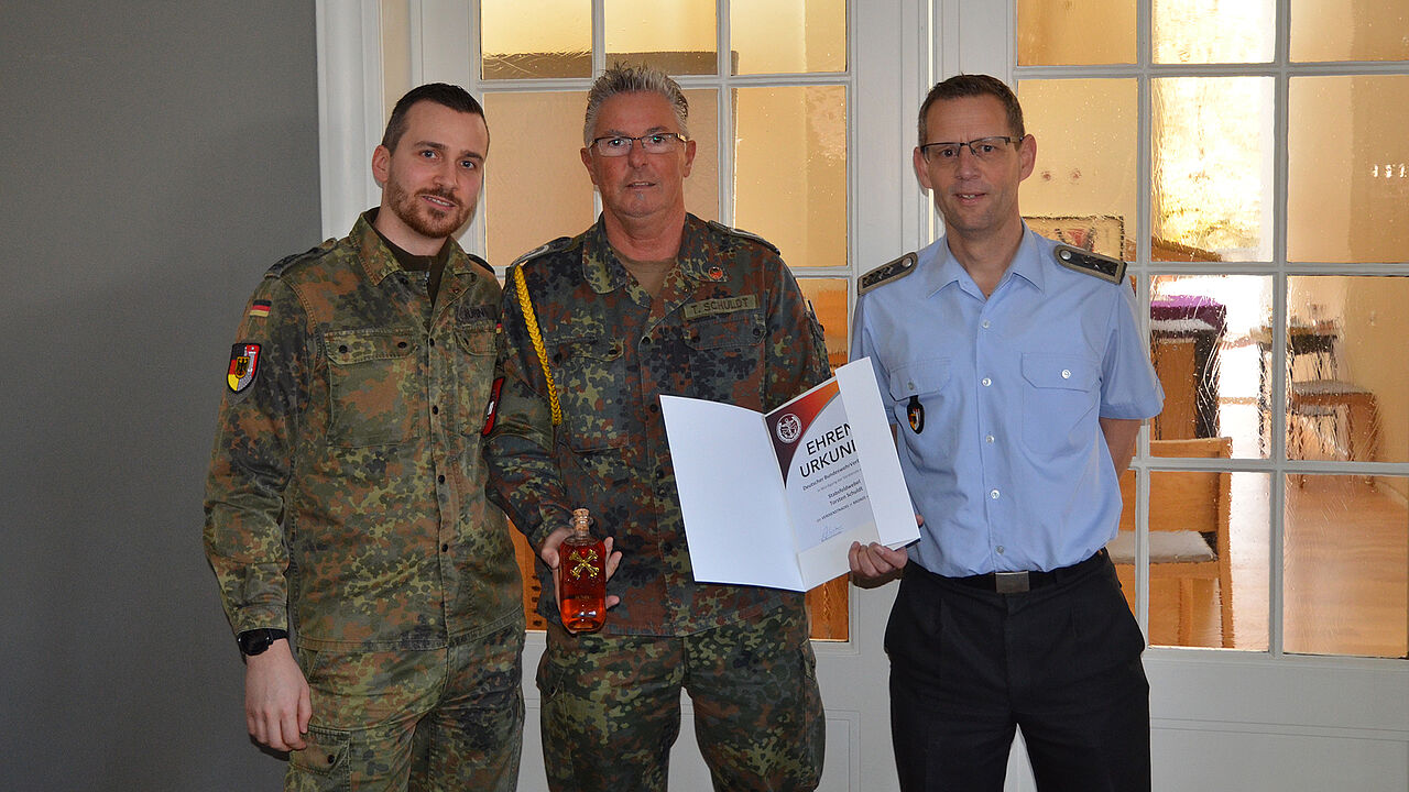In Hamburg, v.l.n.r.: Hauptfeldwebel Stephan Rüping (Schriftführer), Torsten Schuldt und Tobias Kossiski bei der Verabschiedung. Foto: LV Nord
