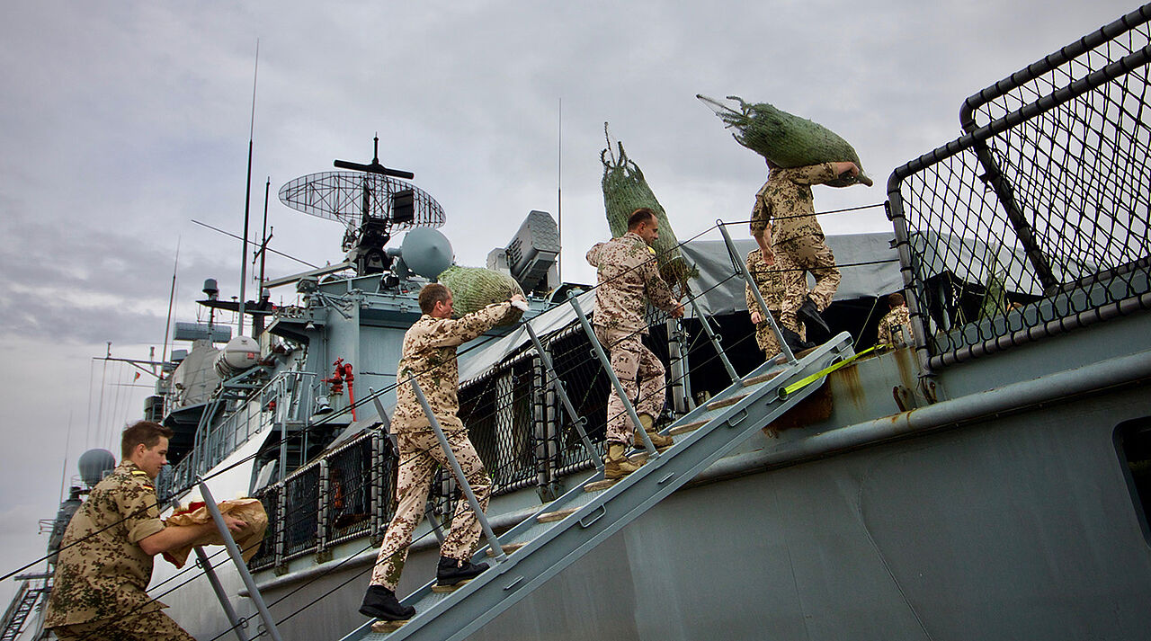 Soldaten tragen aus Deutschland geschickte Weihnachtsbäume auf die „Mecklenburg-Vorpommern“ Foto: dpa
