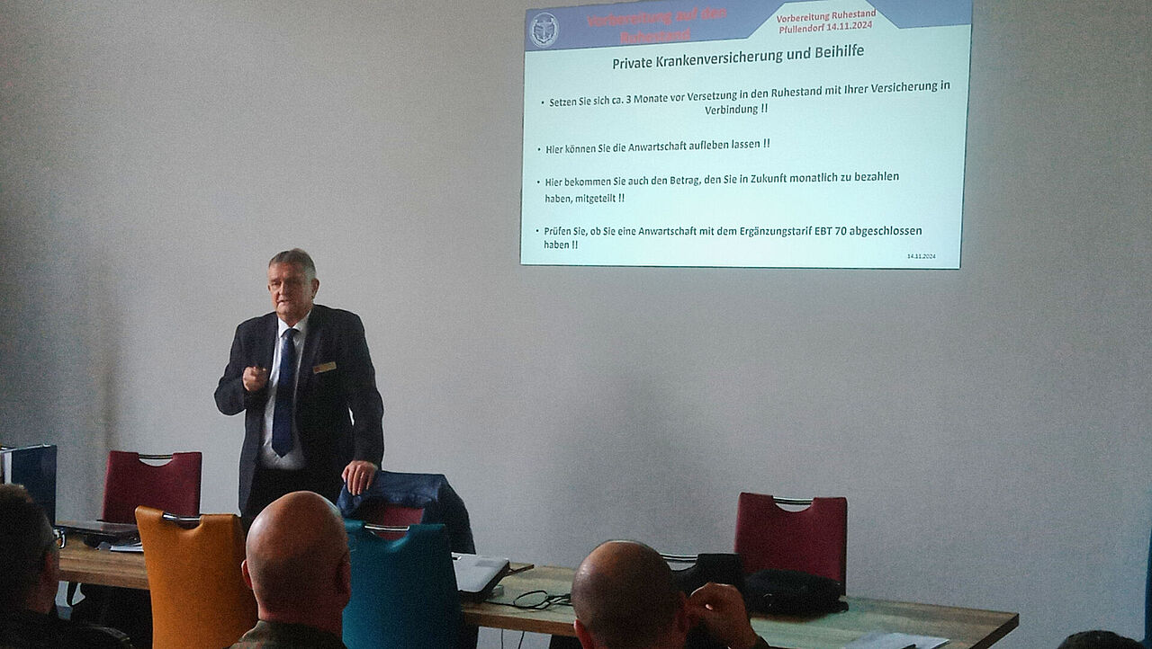 Bei der Begrüßung betonte Ruoß aus eigener Erfahrung die Wichtigkeit der mehrtägigen Seminare zur Alterssicherung. Angeboten werden diese vom Bildungswerk des DBwV, aber auch durch den Dienstherrn. Die heutige Veranstaltung kann da nur ein „Appetizer“ sein, mit dem auch schon die jüngeren Berufssoldaten für das Thema sensibilisiert werden sollen. Für die einen waren die Informationen von Hauber zu Beihilfe, Kranken- und Pflegeversicherung, Versorgungsrecht und Hinterbliebenenversorgung eine Auffrischung ihrer Kenntnisse, andere ergänzten damit ihre ToDo-Liste in Vorbereitung auf den Ruhestand.