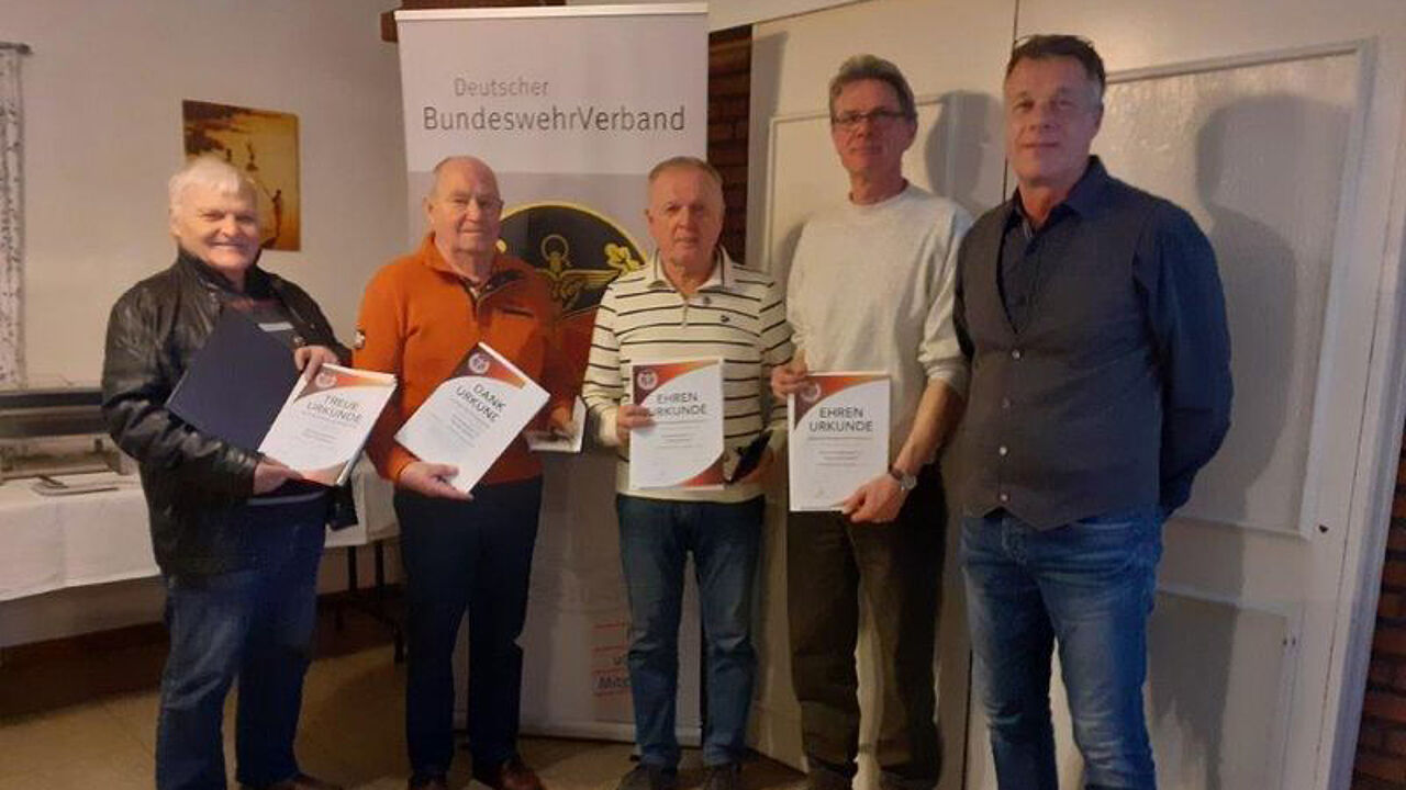 Weitere Ehrungen durch Stabsfeldwebel a.D. Bodo Bettge-Reddöhl erhielten für ihre 20-jährige Mandatstätigkeit die Stabsfeldwebel a.D. Werner Martens und Eckhard Petrat. Letzterer bekam darüber hinaus die Verdienstnadel des DBwV in Silber, die in Bronze ging an Oberstabsfeldwebel a.D. Jürgen Komkowski.