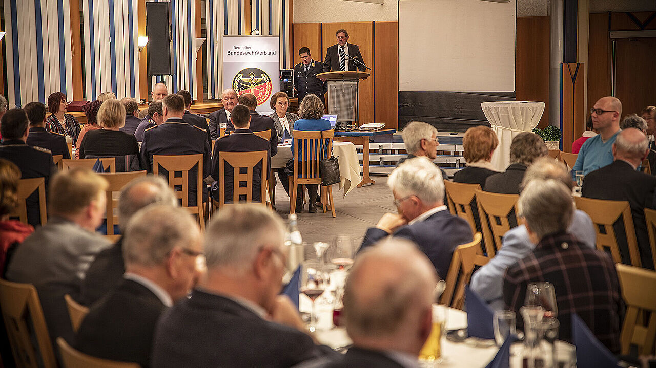 Nach einem kurzen Vortrag des Bezirksvorsitzenden Westfalen, Oberstleutnant a.D. Reinhard Schlepphorst zum Thema Ehrenamt, wurden langjährige und verdiente Mitglieder geehrt. So erhielten Oberstleutnant a.D. Jörg Cosar die Treueurkunde für 50-jährige und Stabsfeldwebel a.D. Hans Kappel für 40-jährige Mitgliedschaft. In Anerkennung ihrer Verdienste um den DBwV wurden Oberstleutnant Falk Neutzer und die Stabsfeldwebel Chris-André Harms und Holger Naumann mit der Verdienstnadel in Bronze ausgezeichnet.