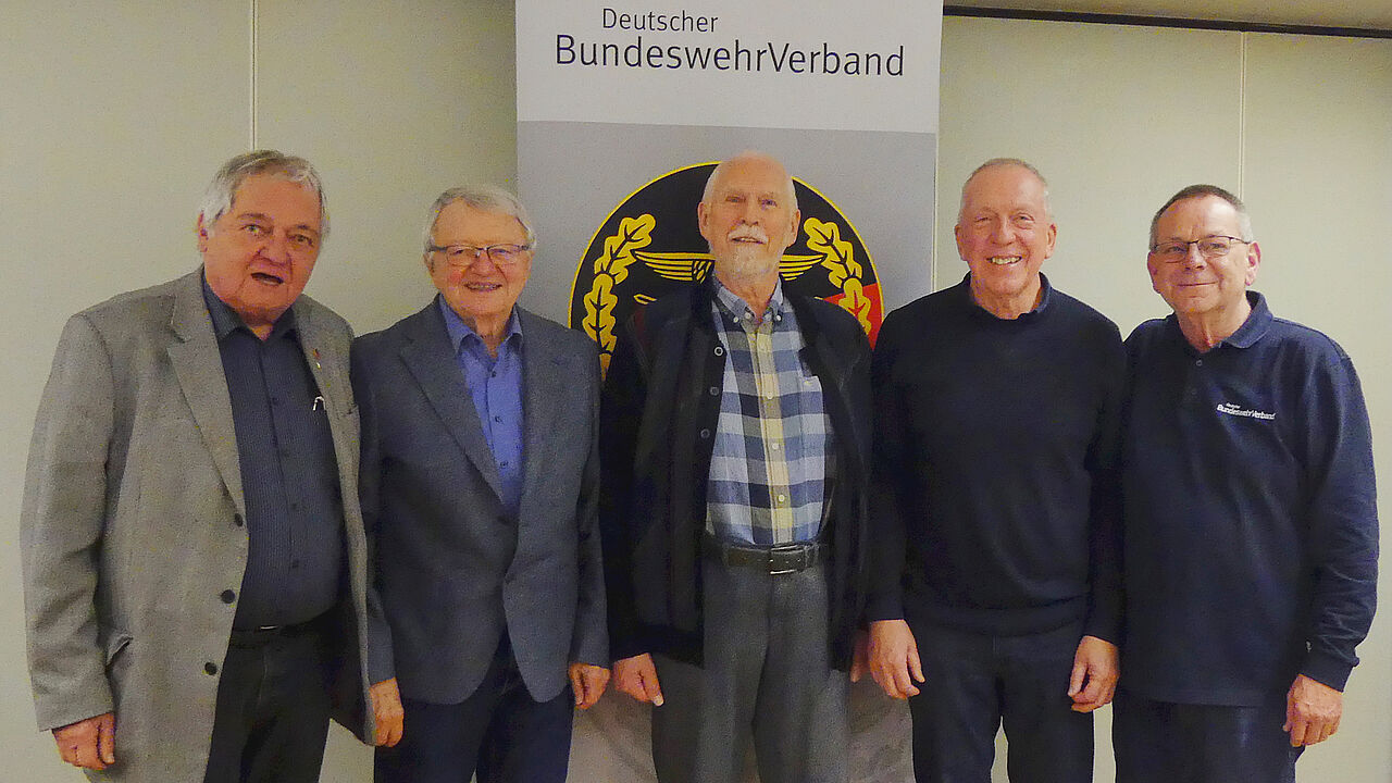 Der Vorstand der Kameradschaft ERH Mengen/Hohentengen unter Vorsitz von Stabsfeldwebel a.D. Roland Richter (v.l.) mit Stabsfeldwebel a.D./Oberstabsfeldwebel d.R. Horst Niedermüller, Oberstleutnant a.D. Dieter Nörz und Hauptmann d.R. Harald Müller sowie dem Bezirksvorsitzenden Oberstabsfeldwebel a.D. Harald Lott. Foto: Udo Lorenz