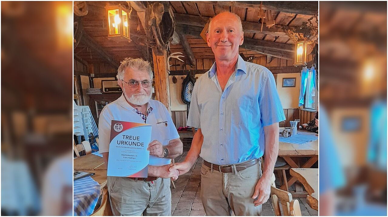 Oberfeldwebel d.R. Franz Hadinger ist seit fünf Jahrzehnten Mitglied im Deutschen BundeswehrVerband. Für diese 50 Jahre Mitgliedschaft dankte ihm der Vorsitzende der Kameradschaft ERH Neuburg/Donau beim Biergartentreff im August 2023 mit Treueurkunde und Treuenadel. Vorsitzender Stabsfeldwebel a.D. Ludwig Birngruber hob hervor, dass die Ehrung für langjährige Mitglieder anerkennt, wie wichtig eine große Mitgliederzahl für die Erfolge der Interessenvertretung sei. Es brauche diesen starken Rückhalt, um Durchschlagskraft und Wahrnehmung der Mandatsträger bei ihrer Arbeit für die Mitglieder in Politik und mit anderen Interessenvertretungen zu entfalten.
