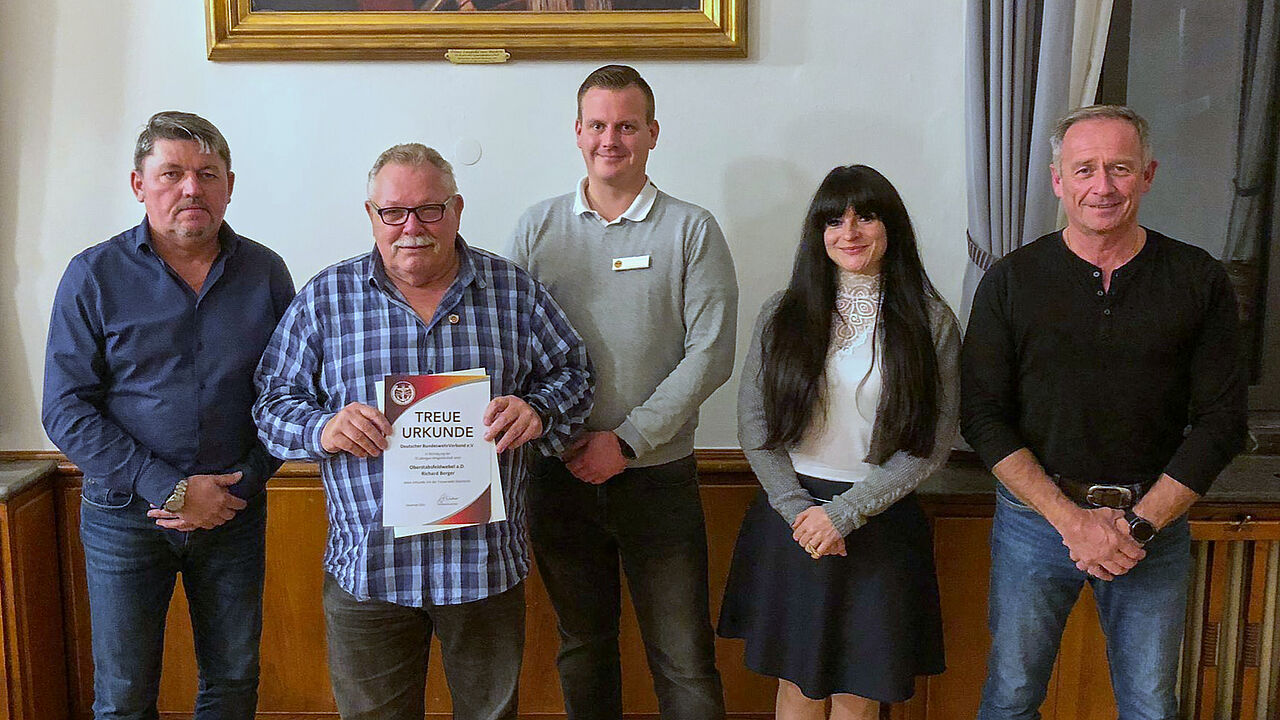 KERH-Vorsitzender Oberstabsfeldwebel a.D. Werner Kandler mit dem Geehrten Oberstabsfeldwebel a.D. Richard Berger, Bezirksvorsitzendem Stabsfeldwebel Christian Schleicher, RAmtfr Schui sowie stellv. Vorsitzender Oberstabsfeldwebel a.D. Manfred Rast. Foto: Kandler