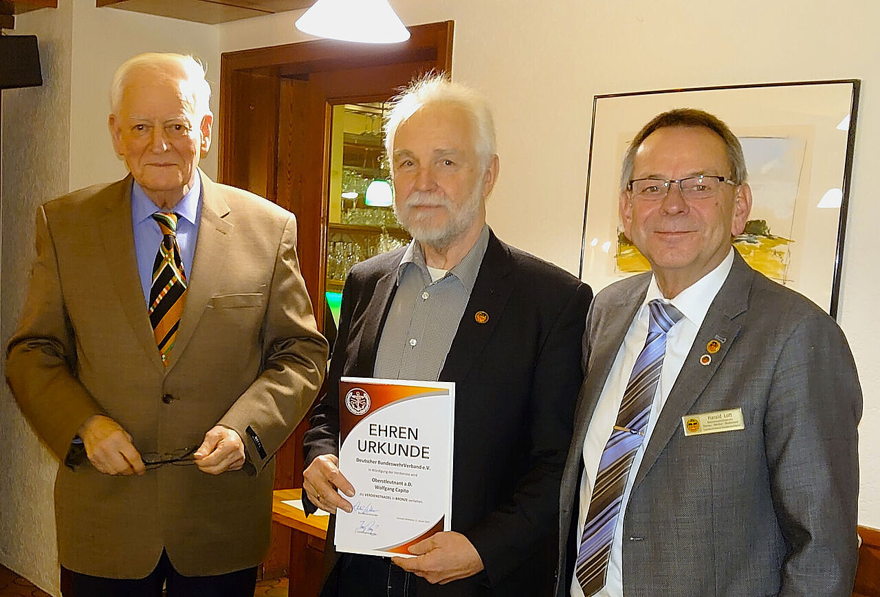 Bezirksvorsitzender Oberstabsfeldwebel a.D. Harald Lott (von rechts) zeichnete Oberstleutnant a.D. Wolfgang Capito mit der Verdienstnadel in Bronze des BundeswehrVerbandes aus, Oberst a.D. Eberhard Möschel gratulierte. Foto: DBwV