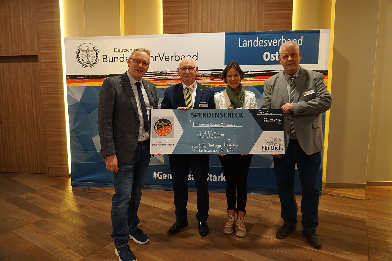 1.170 Euro haben mehrere Kameradschaften der Ehemaligen, Reservisten und Hinterbliebenen des Landesverbands Ost für die Organisation „Life Bridge Ukraine“ gesammelt. Auch auf dem Festakt 35 Jahre Landesverband Ost wurden Spenden für Life Bridge Ukraine gesammelt. Im Rahmen der ERH-Tagung des Landesverbands Ost wurde die Spende von Stabsfeldwebel a.D. und Oberstabsfeldwebel d.R. Frank Udo Reiche, Vorsitzender ERH im Landesverband Ost, an Dr. Janine von Wolfersdorff übergeben. Sie ist die Geschäftsführerin und Gründerin von „Life Bridge Ukraine“.