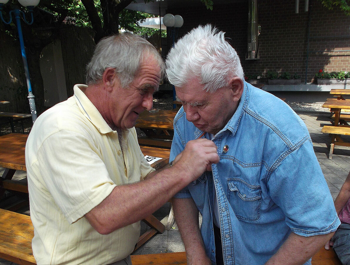 Beim Juni-Stammtisch der KERH Karlsruhe konnte der Vorsitzende, Oberstleutnant a.D. Heinz Simon, Hauptmann a.D. Karl Sieck für 60-jährige Mitgliedschaft in unserem Verband auszeichnen. Der 91-jährige, körperlich und geistig noch äußerst rüstige Geehrte ist ständiger Teilnehmer bei den Stammtischen der Kameradschaft. In seiner gewohnt zurückhaltenden Art nahm Sieck die Auszeichnung entgegen, konnte dabei seine Freude darüber aber nicht ganz verbergen.