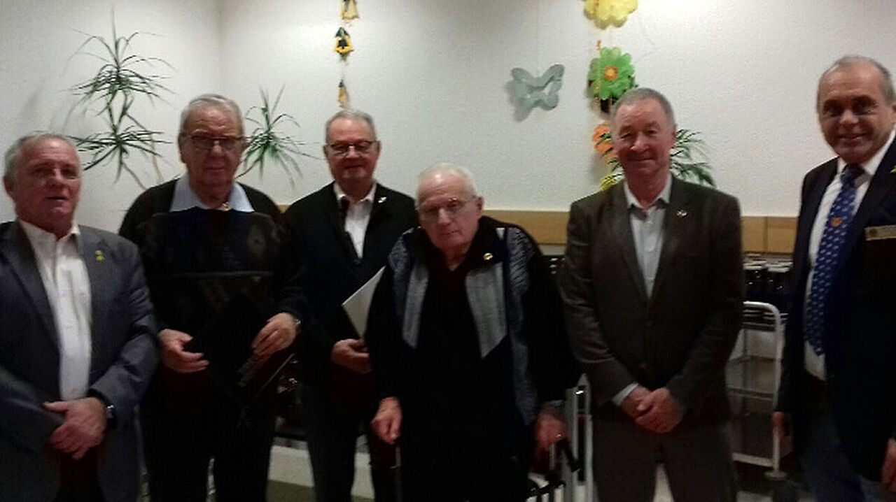Vorsitzender Heinz Simon (v. l.) mit den geehrten Kameraden Wolfgang Dörr, Helmut Schmitz, Hans-Günter Hohm, Thomas Kriechbaumer sowie Bezirksvorsitzendem Matthias Schneider. Foto: Ralf Werner