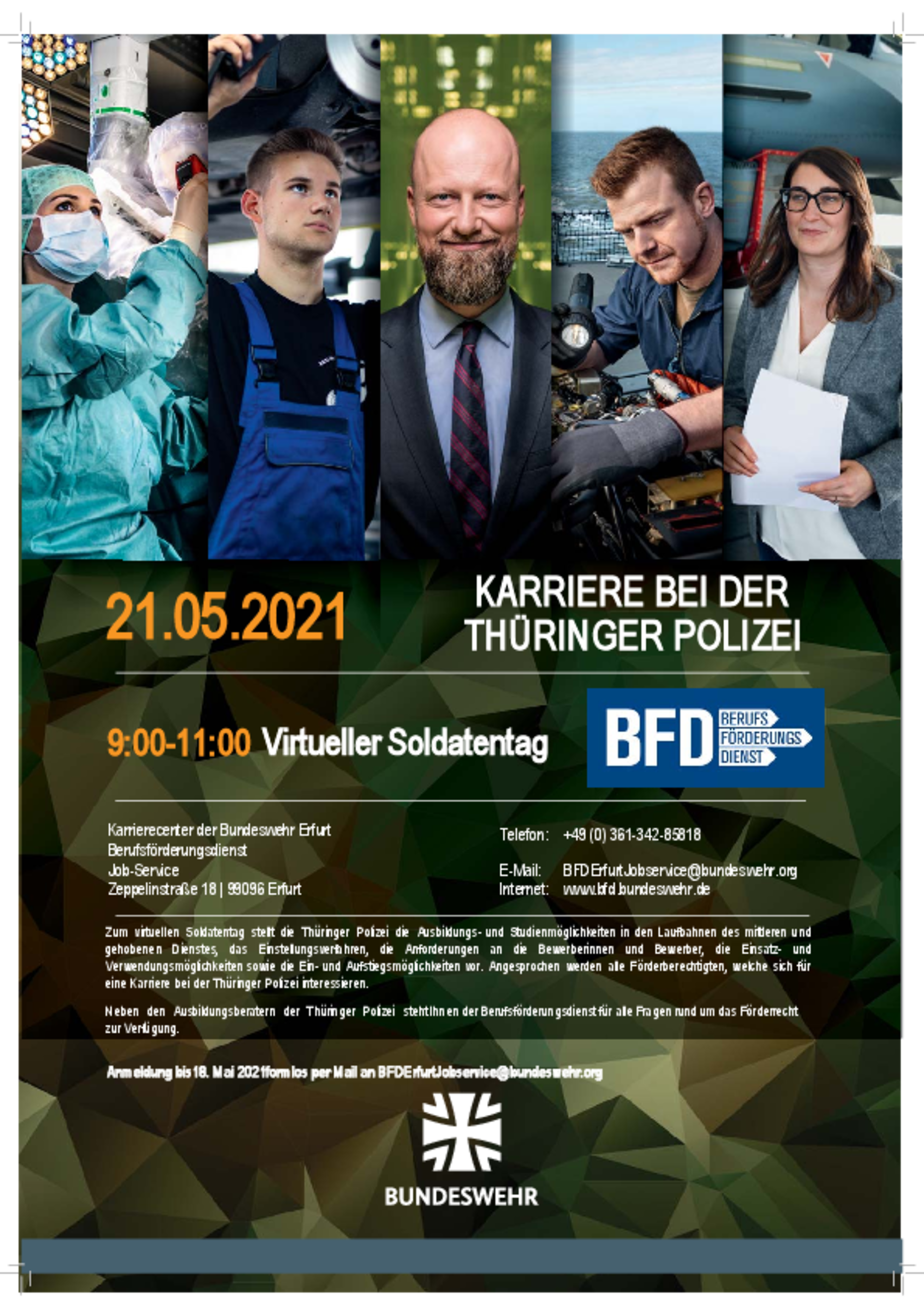 Virtueller Soldatentag Anmeldung bis 18.05 formlos oder per E-Mail: BFDErfurtJobservice@bundeswehr.org