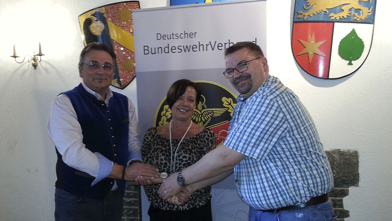 (v.l.): Bezirksvorsitzender Jung gratuliert Simone Aunkofer zur Wahl als StoKa-Vorsitzende und dankt Friedel Wegner. Foto: DBwV