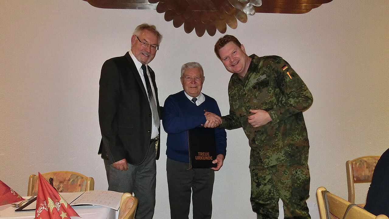 Im hessischen Frankenberg beglückwünschte der stellvertretende Vorsitzende der Standortkameradschaft, Hans-Jürgen Wilhelm, gemeinsam mit dem Bezirksvorsitzenden Helmut Pries das Vorstandsmitglied Stabsfeldwebel a.D. Dieter Engel für 25-jährige Mitgliedschaft. Oberstleutnant a.D. Manfred Scholz, Hauptmann a.D. Friedhelm Piston, Stabsfeldwebel a.D. und Oberstabsfeldwebel d. R. Robert Mütze wurden für 40-jährige Mitgliedschaft geehrt.