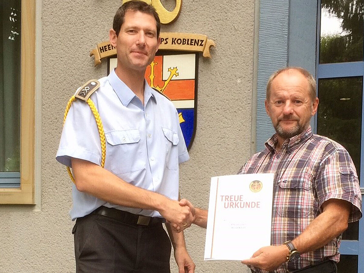 Überraschung für Oberstleutnant Horst Eberl unmittelbar vor dem Dienstzeitende. Der Vorsitzende der Truppenkameradschaft (TruKa) Gneisenau-Kaserne, Stabsfeldwebel Markus Römer, verabschiedete den Stabsoffizier unmittelbar vor seinem Dienstzeitende aus dem Kreis der aktiven Kameraden und überreichte Oberstleutnant Eberl in großer Runde die Dankurkunde für seine 40jährige Treue zum DBwV.