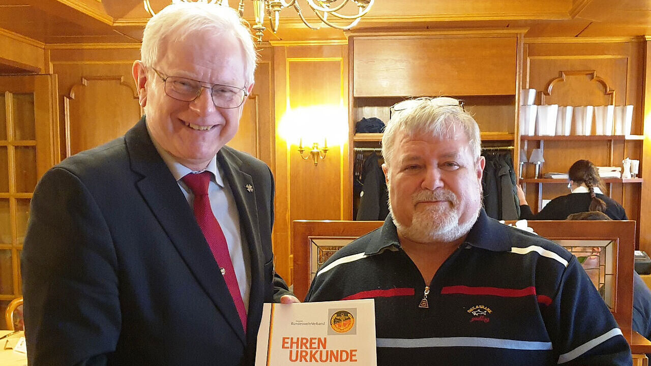Neben der einer umfangreichen Information zu Ergebnissen, Ereignissen und Geschichten rund um die 21. Hauptversammlung hatte er auch eine Ehrung im Gepäck. Gemeinsam mit dem KERH-Vorsitzenden, Oberstabsfeldwebel a.D Franz-Peter Müller, würdigte Jung die Verdienste von zwei langjährigen aktiven Mitstreitern der Kölner Kameradschaft. Oberstabsfeldwebel a.D. Wolf-Dieter Zimmermann erhielt zum Dank und zur Erinnerung an seine ehrenamtliche Tätigkeit eine Urkunde der Kameradschaft vom Vorsitzenden. Zimmermann leitete bis Ende des letzten Jahres den Stammtisch Köln Süd. Bei diesen Stammtischen treffen sich ehemalige Soldaten zum geselligen Beisammensein in ihren ‚Veedeln‘ (Stadtteilen). Nun, nach 14 Jahren als Stammtischvater, spielt die Gesundheit nicht mehr mit und Dieter kann die Aufgabe als Stammtischvater nicht mehr wahrnehmen berichtet Stabsfeldwebel a.D. Joachim Hentschel. Außerdem wurde Hauptmann a.D. Wolfgang Everschor mit der DBwV-Verdienstnadel in Silber ausgezeichnet. Der DBwV würdigt damit seine unermüdliche und verantwortungsvolle Aufgabe als Berater in Beihilfeangelegenheiten und anderen sozialen Tätigkeiten innerhalb der Kameradschaft.