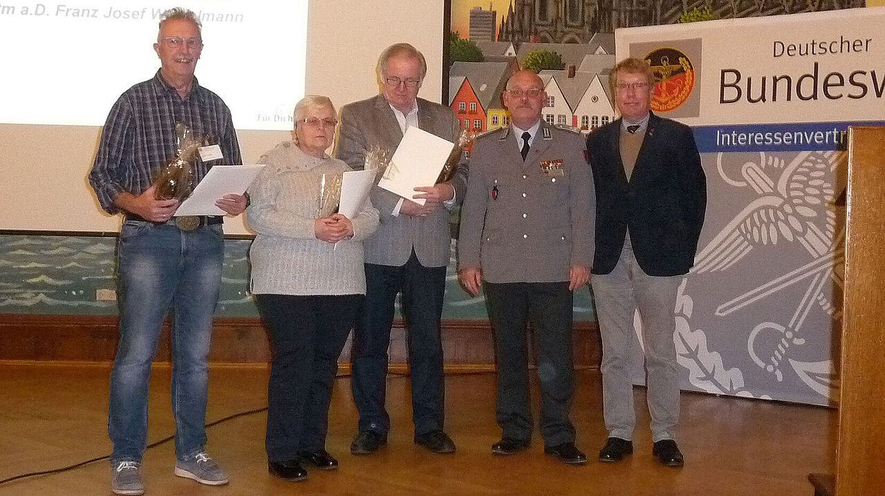 Valerie Ehrlichmann und Oberstabsfeldwebel a.D. Josef Lindlar wurden mit der Verdienstnadel in Bronze und Hauptmann a.D. Franz Josef Wiegelmann mit der silbernen Nadel ausgezeichnet. Die Treueurkunde für langjährige DBwV-Mitgliedschaft erhielten: für 60 Jahre - Oberst a.D. Lorenz Graf Strachwitz, Oberstleutnant a.D. Hans Lieder, Kapitänleutnant a.D. Reinhard Wolter. Für 50 Jahre -Hauptmann a.D. Ralf Bornholdt, Hauptmann a.D. Werner Mirr, Oberstleutnant a.D. Hans-Dieter Thauer und 25Jahre Oberstleunant a.D. Dirk Paatz. Abgerundet wurde die Veranstaltung durch einen Vortrag zum Thema „das Schiedsamt in NRW“, gekonnt berichtete Stabsfeldwebel a.D. Ralf Stehr aus seiner mehrjährigen Erfahrung als ehrenamtlicher Schiedsmann.