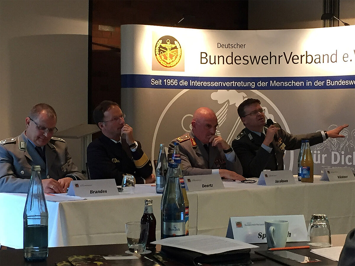 In der außen- und sicherheitspolitischen Community Berlins würden – im Hintergrund – neue Einsätze wie in Nordafrika stringent abgeleitet werden. Der Anspruch an die Bundeswehr könnte diesbezüglich steigen, so Wüstner. Dabei gelinge es nur bedingt, die Politik von der Nichtmachbarkeit von noch weiteren Einsätzen zu überzeugen. Denn trotz vieler 25-Millionen-Euro-Vorlagen habe sich die Materiallage noch nicht grundlegend verändert. Eine große Baustelle für die nächste Koalition sei deshalb – um zu beschleunigen – das Haushalts- und Vergaberecht, stellte Wüstner fest. Hier arbeite der Verband mit Parteien und Ministerien zusammen, die Vorschläge lägen bereits in der Schublade. Fraglich bleibt jedoch noch, ob eine neue Bundesregierung diese dann tatsächlich herausnehme.In der sich anschließenden Podiumsdiskussion mit Generalleutnant Jacobson, Kommando Heer, Kommandeur Einsatz und stv. Inspekteur des Heeres sowie Flottillenadmiral Axel Deertz, Marinekommando, Abteilungsleiter Einsatz und dem Landes- sowie Bundesvorsitzenden des DBwV wurde aus dem Publikum neben der teilweisen Überlastung durch eine Vielzahl von Einsätzen und Übungen auch die „Verbeamtung“ samt Verantwortungsdiffusion der Bundeswehr kritisiert. Gewollter Verantwortungsübernahme würden immer wieder Steine in den Weg gelegt. Gleiches unterstrich ein anwesender Leiter eines Dienstleistungszentrums. Für Soldaten wäre das Umsetzen der „Auftragstaktik“ aufgrund zu vieler Verantwortungsdompteure kaum noch möglich, wurde geäußert. Auch bezüglich der noch immer vorhandenen Mangelverwaltung an Material und Personal nahmen Kommandeure kein Blatt vor den Mund. Und neben den vielen Trendwenden bleibt eine elementar: die Trendwende Vertrauen. Jeder Führungsebene müsse wieder Verantwortung gegeben, statt über Beipässe zum Dienstweg entzogen werden.