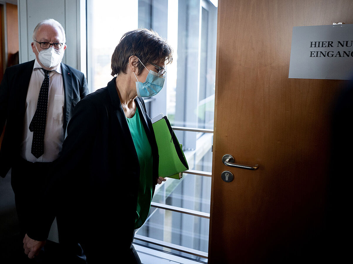Annegret Kramp-Karrenbauer, Bundesministerin der Verteidigung, nimmt am 3. März 2021 vor dem Verteidigungsausschuss des Bundestags Stellung zur Munitionsaffäre und Vorfällen im Kommando Spezialkräfte (KSK). Foto: picture alliance/dpa | Kay Nietfeld