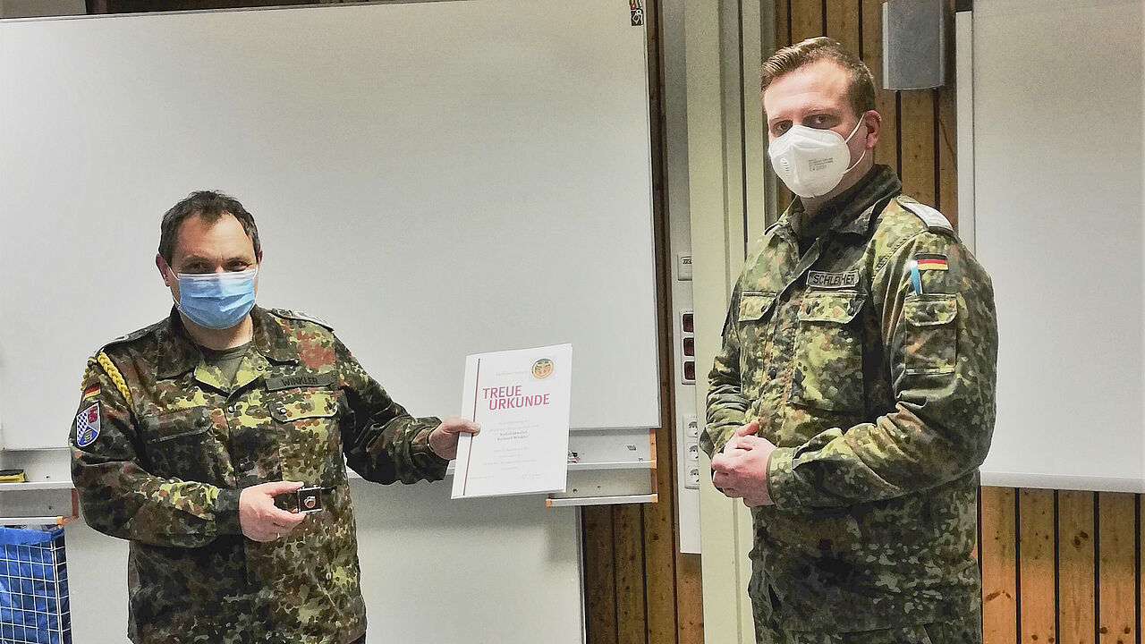 Stabsfeldwebel Richard Winkler wurde kürzlich in das Kraftfahrausbildungszentrum Kümmersbruck versetzt. TruKa-Vorsitzender Hauptfeldwebel Christian Schleicher stellte in einem Gespräch mit dem neuen Mitglied seiner Kameradschaft fest, dass der Stabsfeldwebel bereits über 25 Jahren Mitglied im DBwV ist. Bereits eine Woche nach dem Gespräch überraschte der TruKa-Vorsitzende seinen Kameraden und überreichte Winkler Treuenadel und -urkunde für seine 25-jährige Mitgliedschaft im DBwV.