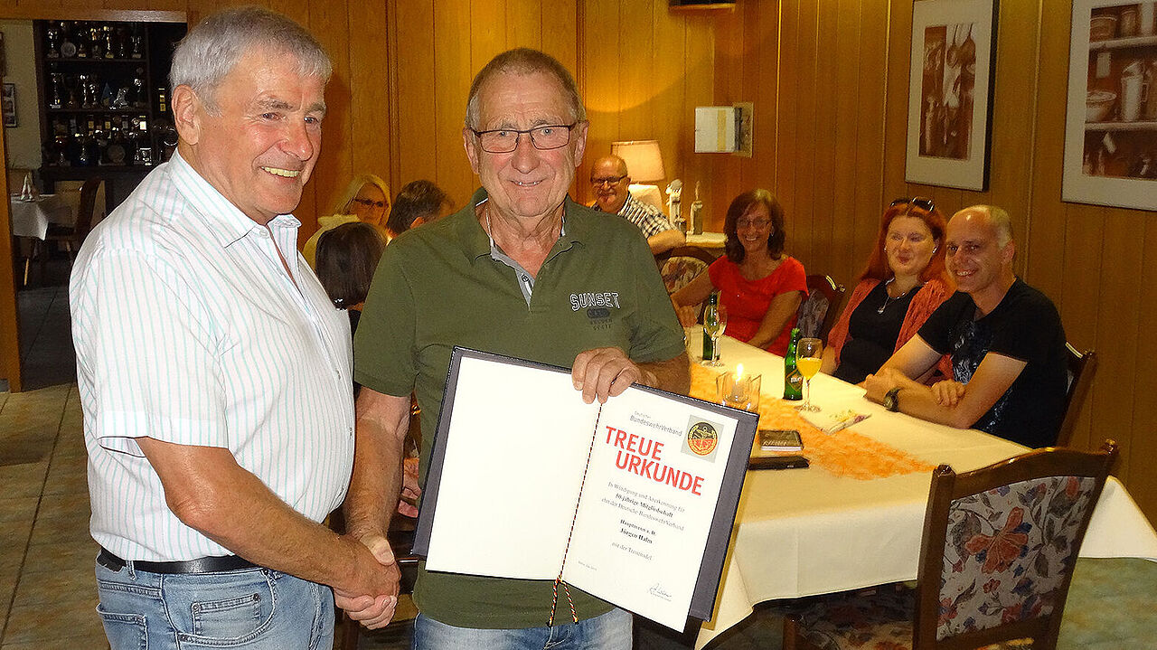 In Kusel erhielt Hauptmann a.D. Jürgen Halm (re) die Treueurkunde/-Nadel für 50 Jahre Mitgliedschaft im DBwV. Foto: Bernhard Mohr