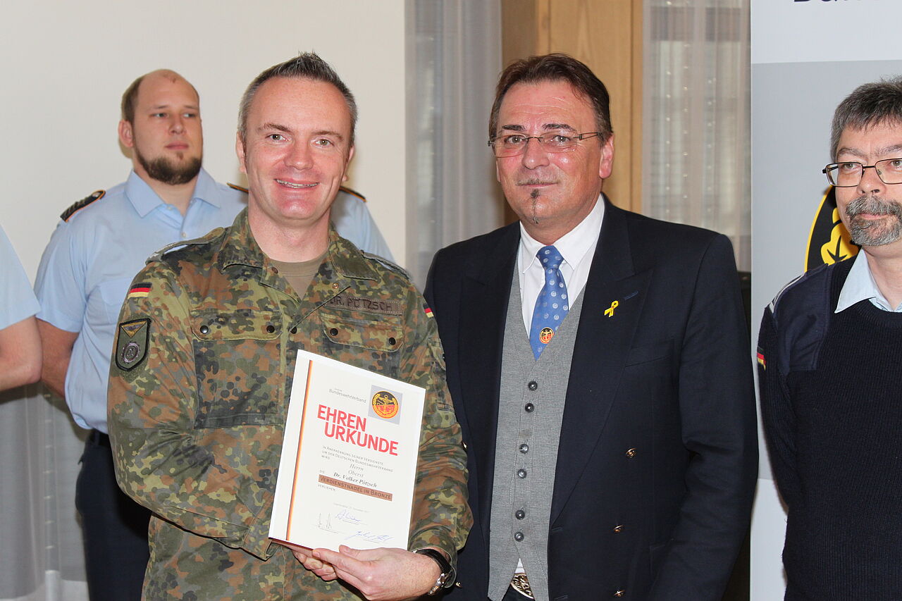 Der Bezirksvorsitzende dankte Oberst Dr. Volker Pötzsch für seine andauernde, großartige Unterstützung der Verbandsarbeit mit der Ehrennadel des DBwV in Bronze. Nach Informationen zur Presse- und Öffentlichkeitsarbeit des Landesverbands in den verschiedenen Medien (Magazin, Internet, Community, Facebook) – vorgetragen durch den Beauftragten Oberstleutnant a.D. Ingo Kaminsky – diskutierten die Mandatsträger in einer internen Gesprächsrunde Themen zur weiteren Gestaltung der Verbandsarbeit.