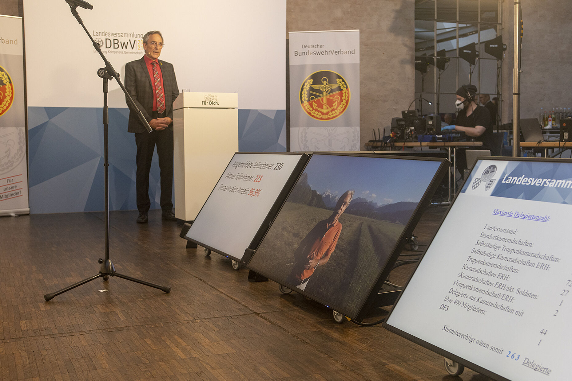 Nachdem der Landesvorsitzende die Delegierten begrüßt und der Ehrenvorsitzende Oberst a.D. Ulrich Kirsch einen Video-Gruß übermittelt hatte, betrat der Bundesvorsitzende die Bühne: Oberstleutnant André Wüstner nahm die Ehrung zweier verdienter Mandatsträger vor – natürlich auch auf elektronischem Wege. Oberstabsfeldwebel a.D. Alfred Gebhardt ist seit fünf Jahrzehnten als in den vielfältigsten Mandaten des DBwV unermüdlich aktiv. Stabsfeldwebel a.D. Charlie Boeg kann man ebenso als „Urgestein“ des Verbandes bezeichnen. Er erhielt die Treuurkunde für seine 50-jährige Mitgliedschaft. Wüstner lobte das Wirken der treuen Verbandsmitglieder: „Ohne die Basis wäre alles nichts.“