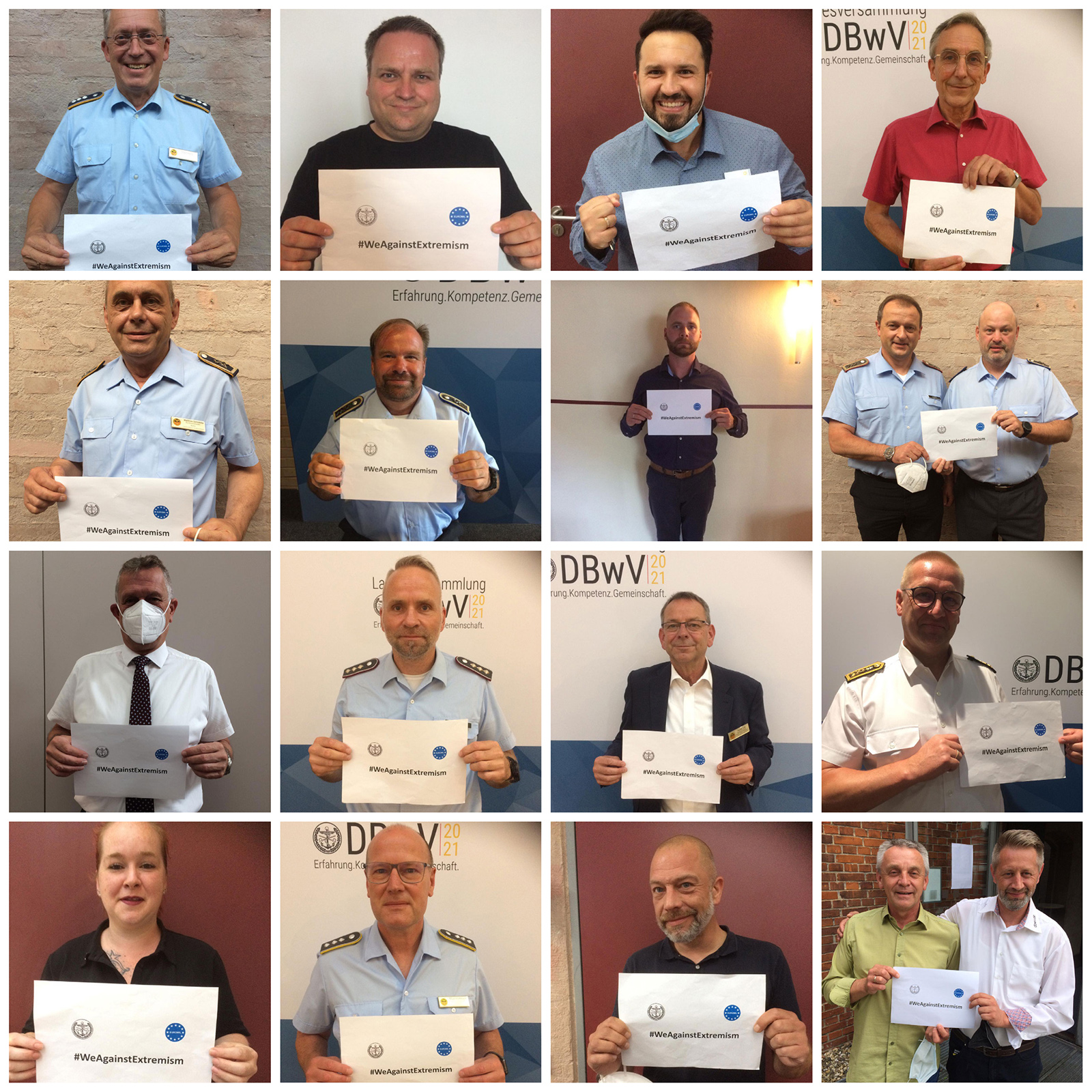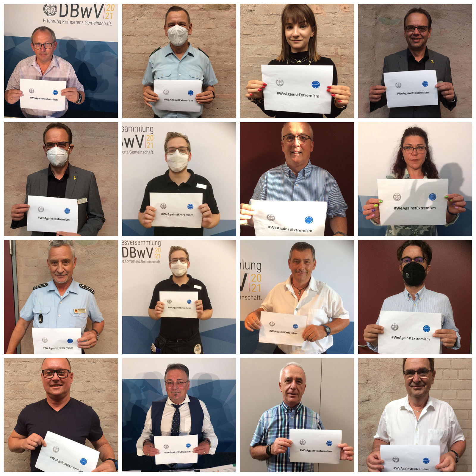 Bamberg. Ein starkes Zeichen gegen Extremismus: Am Rande der Landesversammlung Süddeutschland haben sich zahlreiche Teilnehmer an der der Social Media-Kampagne #WeAgainstExtremism von EUROMIL beteiligt, die vom DBwV unterstützt wird. Doch nicht nur Mandatsträger und Delegierte des Verbandes machten in Bamberg mit, sondern auch Mitarbeiterinnen und Mitarbeiter des gastgebenden Hotels und des Technikdienstleisters, der die Landesversammlung unterstützt. Das Signal ist klar: Extremismus geht uns alle an! Zum Hintergrund: Die bereits laufende Social Media-Kampagne gegen Extremismus in den Streitkräften erfährt aktuell großen Zuspruch. Sie wurde durch EUROMIL zu einer europäischen Kampagne ausgeweitet.