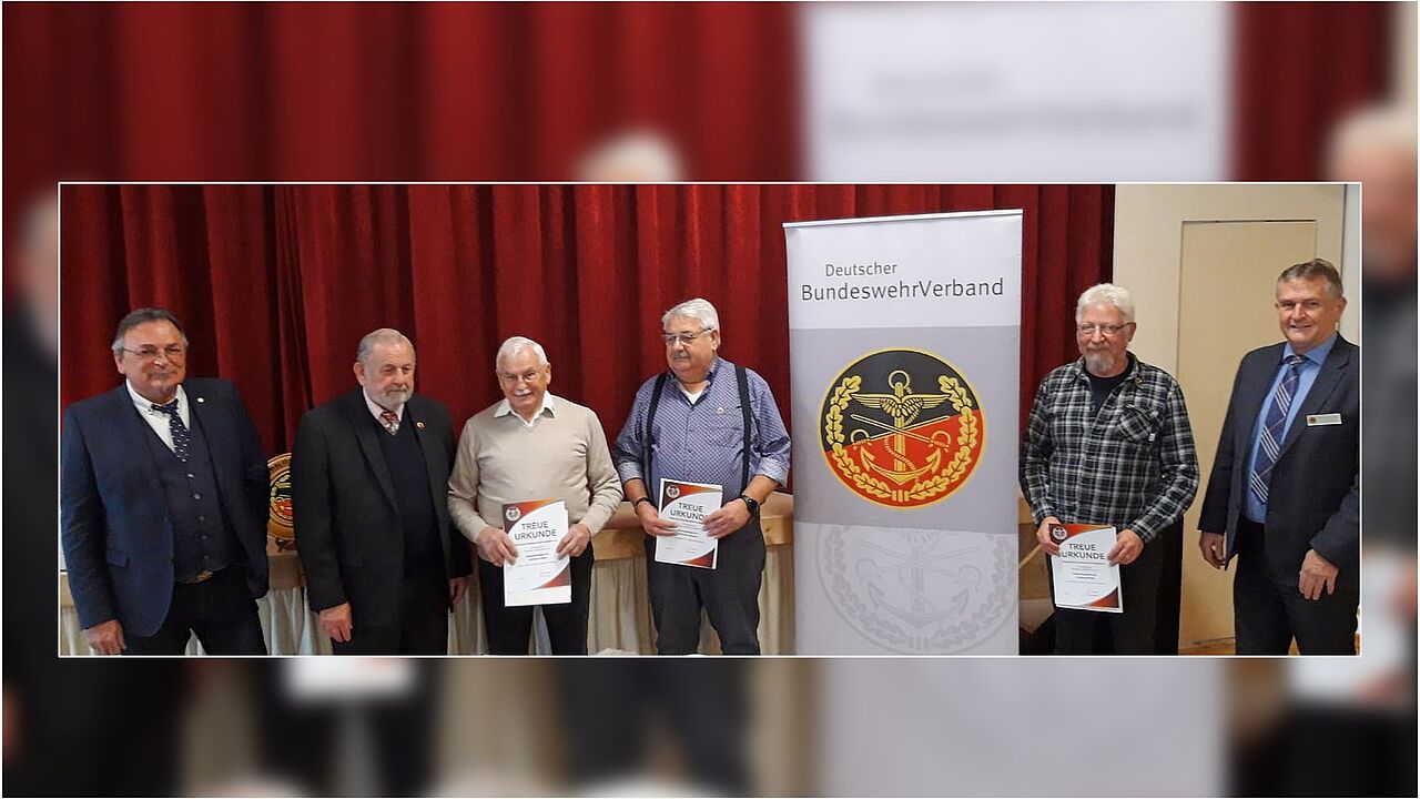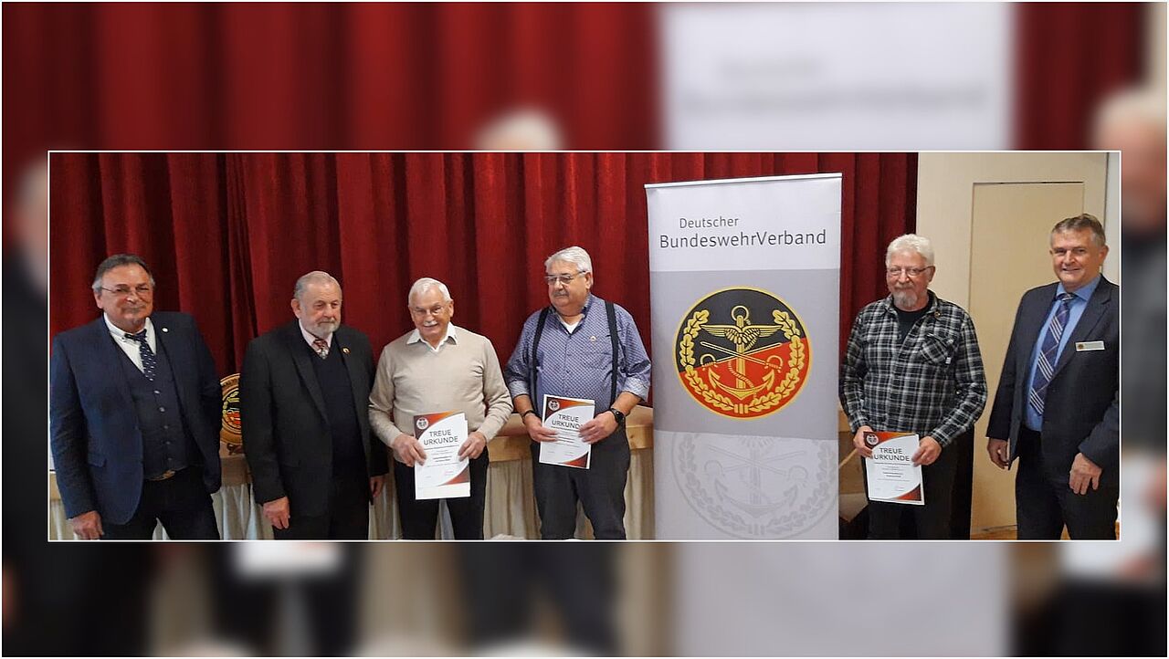 Nach dem gemeinsamen Mittagessen während der Adventsfeier nutzten der Vorsitzende ERH im Landesverband Süddeutschland, Oberstabsfeldwebel a.D. Bernhard Hauber, und Bezirksvorsitzender Stabsfeldwebel a.D. Franz Jung die Gelegenheit, über die Verbandsarbeit zu informieren und die intensive Arbeit der hiesigen Kameradschaft zu loben. Sie sprachen elf Mitgliedern für 40- und 25-jährige Treue zum BundeswehrVerband ihren Dank aus und überreichten davon den drei Anwesenden ihre Treueurkunden. Eine besondere Ehrung für geleistete Verbandsarbeit erhielt Oberstleutnant a.D. Armin Dries mit der Verdienstnadel in Bronze.
