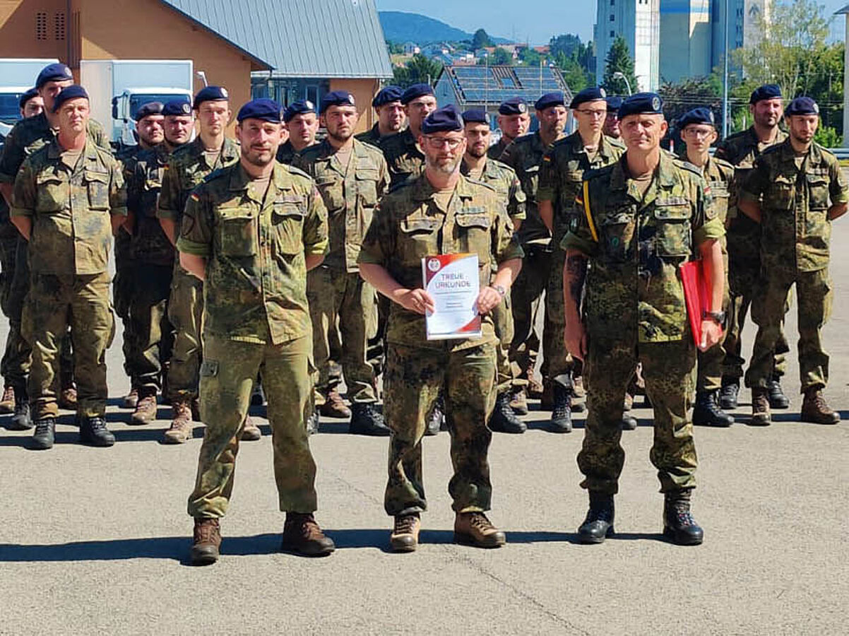 „Es war mal eine etwas andere, ehrenvolle Umgebung für eine Mitgliederehrung“, berichtet Oberstabsfeldwebel Frank Schmitt, Vorsitzender der Truppenkameradschaft (TruKa) Lebach von der Aushändigung der Treueurkunde für 25-jährige Mitgliedschaft im Deutschen BundeswehrVerband an Stabsfeldwebel Carsten Lembcke. Im Anschluss an die Aushändigung der Urkunde anlässlich des Dienstjubiläums durch Kompaniechef Major Sven Peter war „dies eine gute Gelegenheit, mit über zwei Dritteln an anwesenden Vorstandsmitgliedern die Ehrung des DBwV ebenso vor der Front der Kompanie zu vollziehen“, so Schmitt und weiter: So sahen auch die jungen Soldaten, dass der DBwV am besten von Anfang der Dienstzeit an ein wichtiger Bestandteil eines Soldatenlebens sein sollte. Für Stabsfeldwebel Carsten Lembcke jedenfalls war es nie eine Frage, ob oder warum man Mitglied im Deutschen BundeswehrVerband sein sollte.